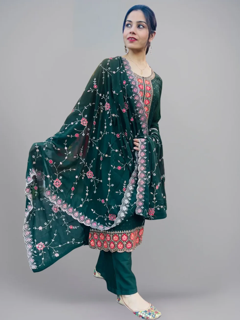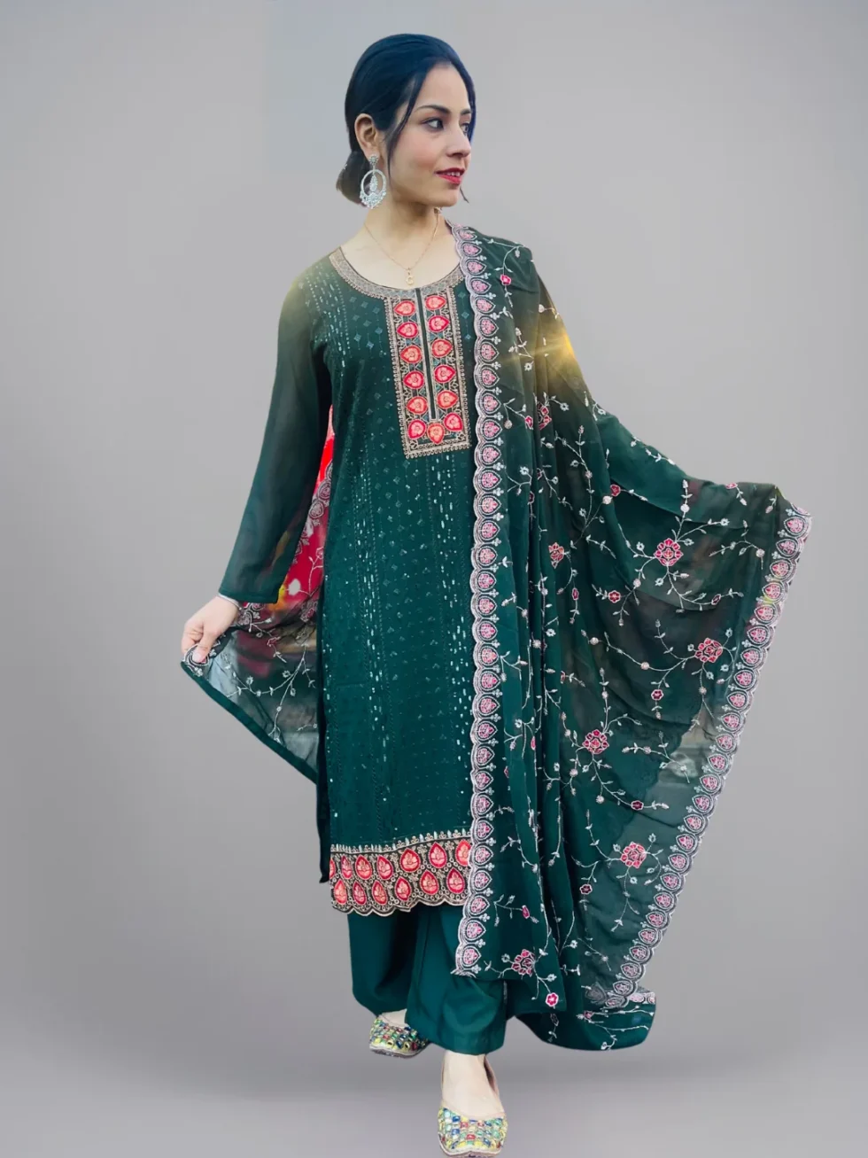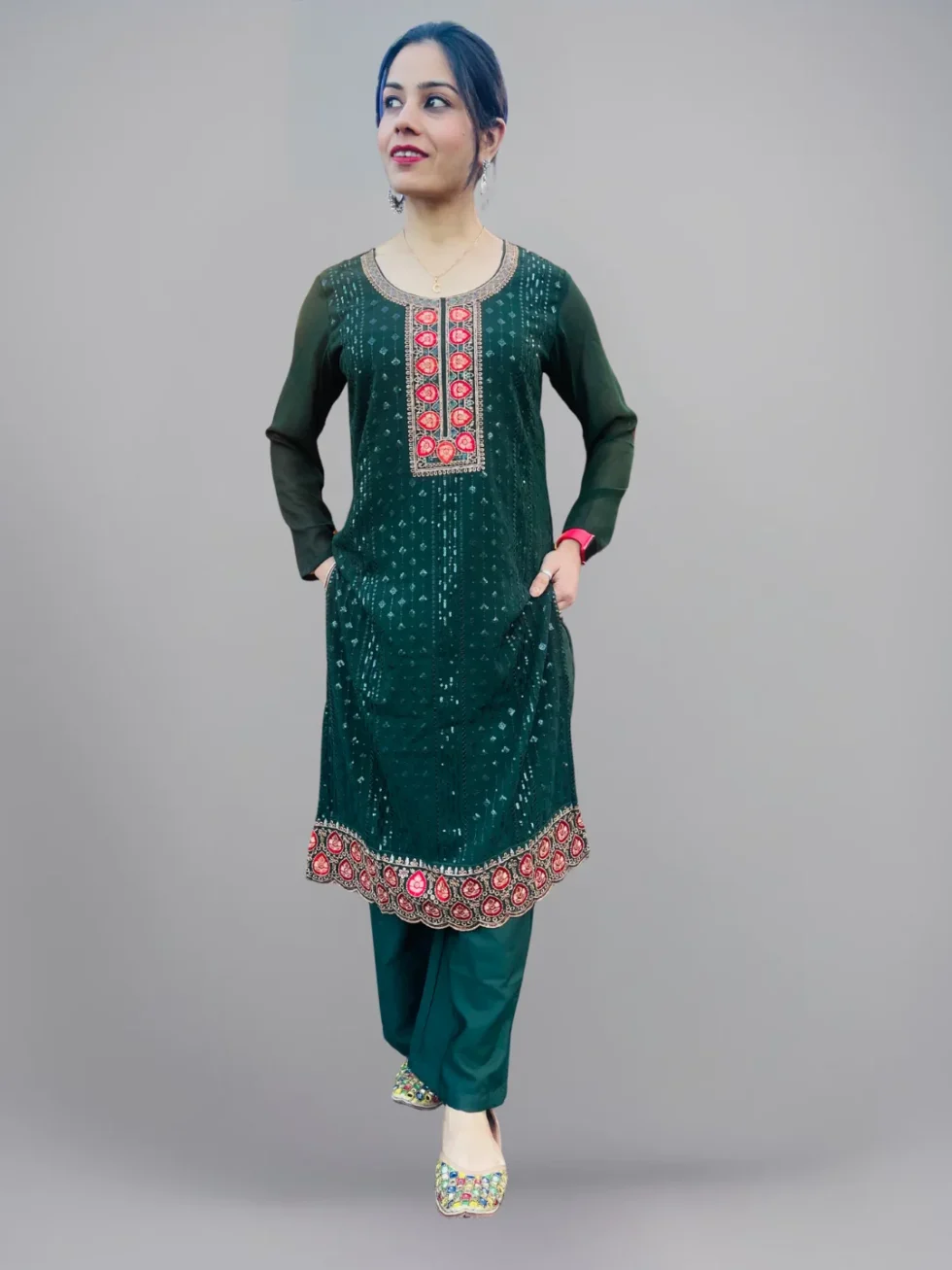 Embrace effortless style with the Memsaab Elegant Bottle Green Georgette Palazzo Suit, featuring bottle green georgette fabric adorned with sequin work and embroidery. Ideal for party wear and casual outings, blending traditional charm with modern comfort.