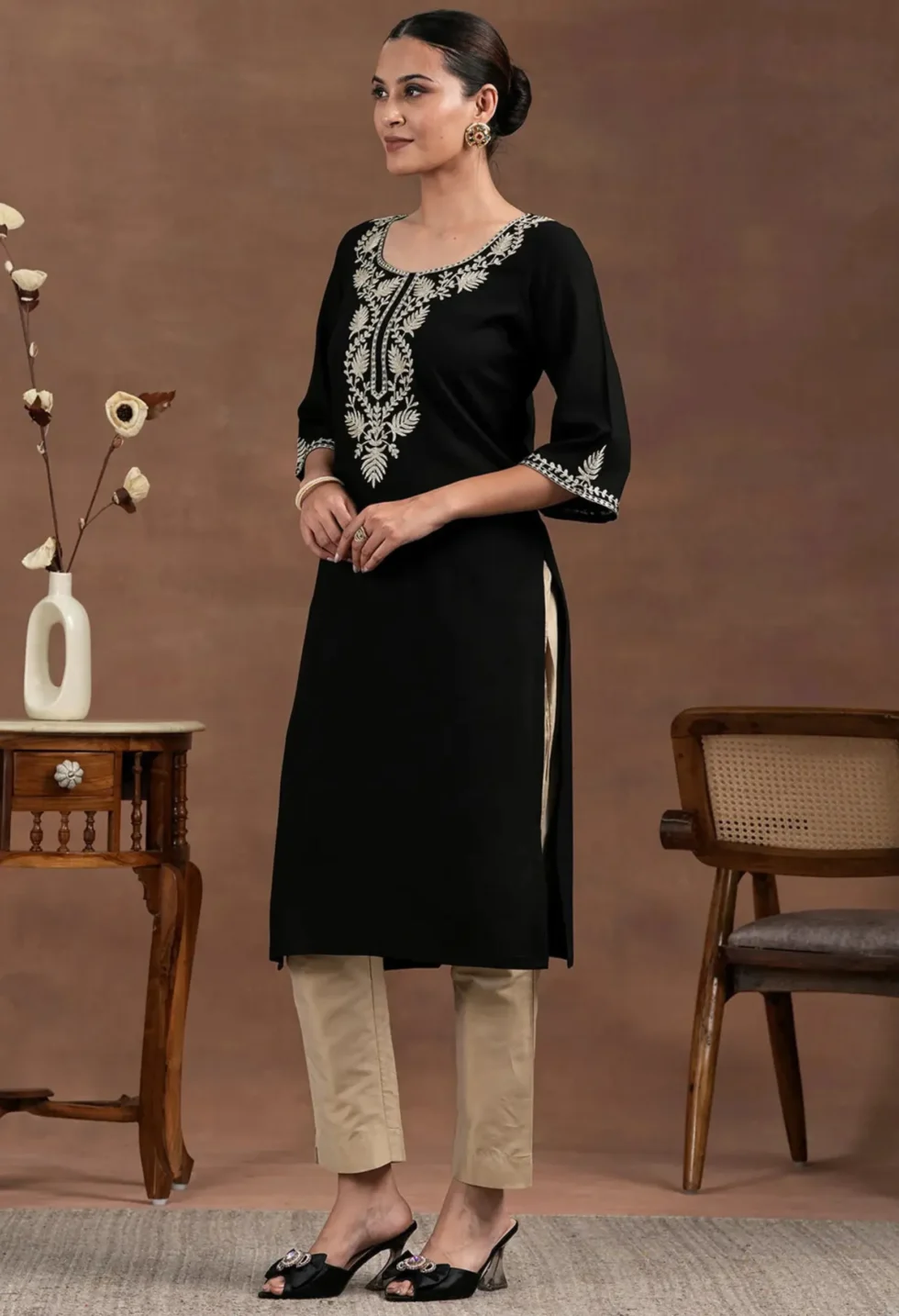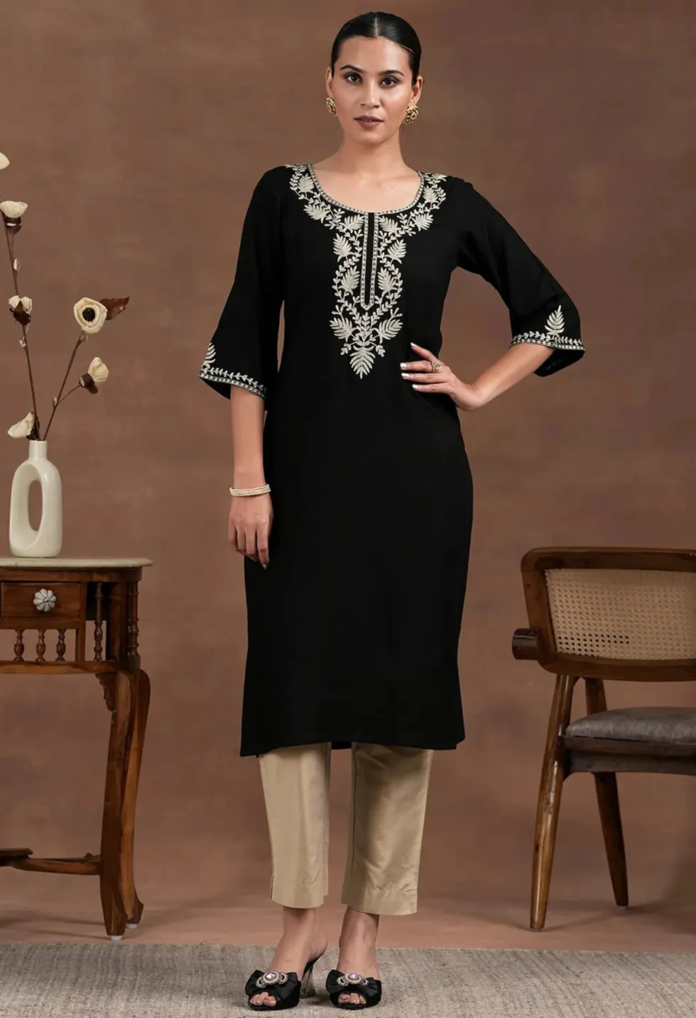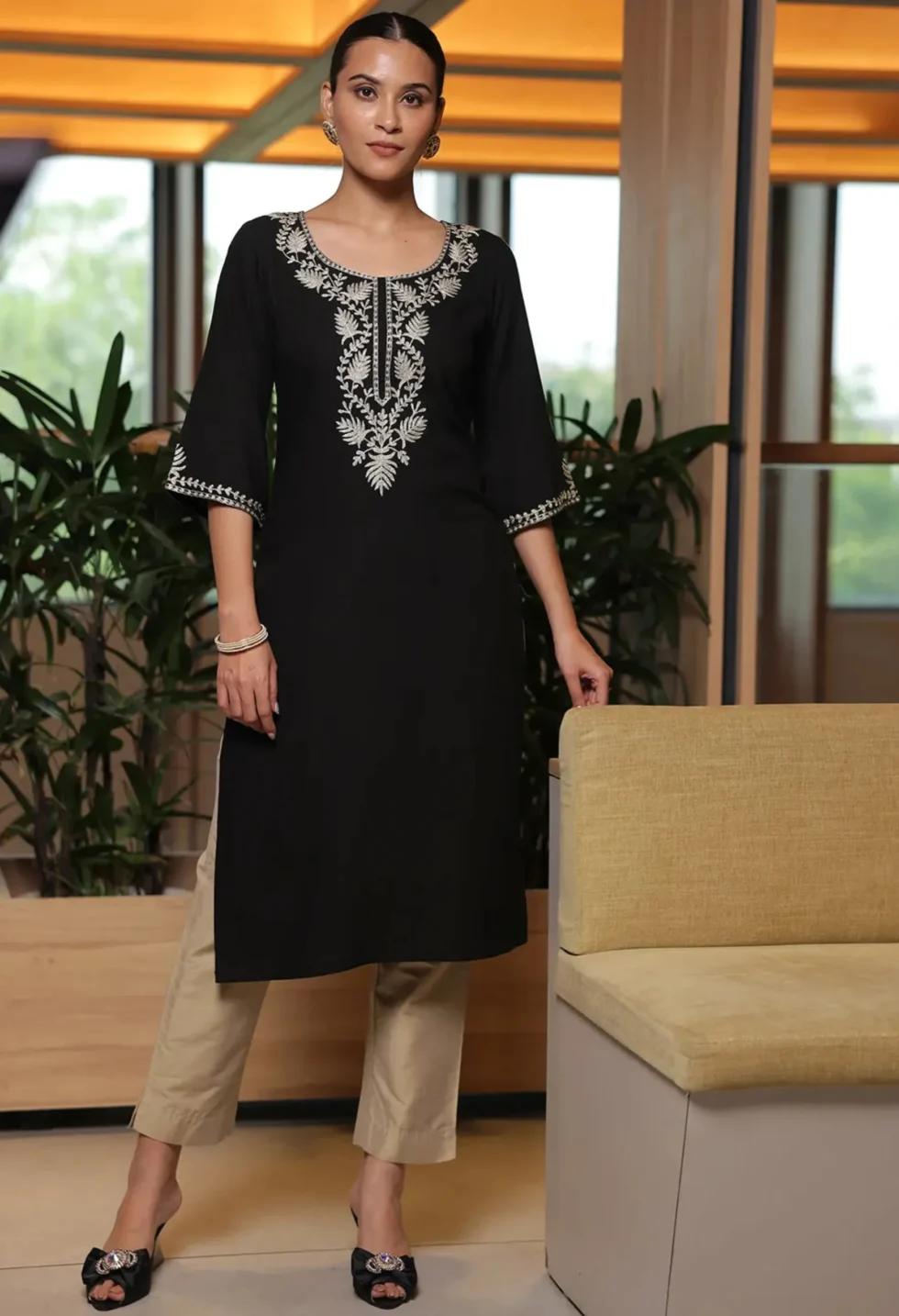 The Memsaab Black and Gold-Toned Straight Kurta features a floral yoke design, zari detail, and a straight silhouette. Crafted from viscose rayon, perfect for festive and semi-formal wear.