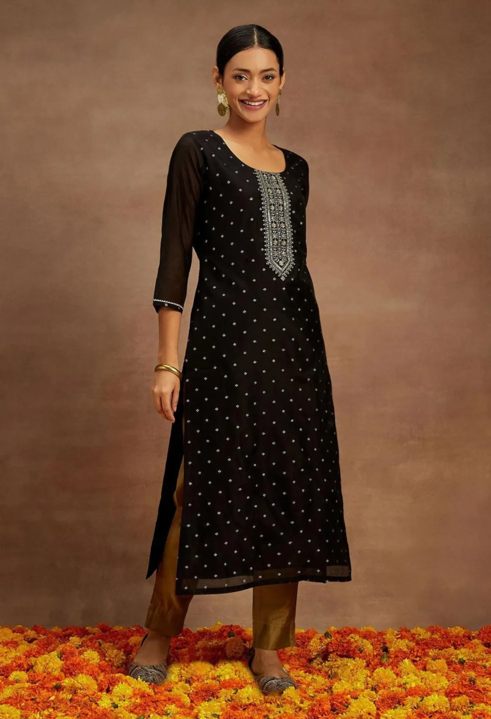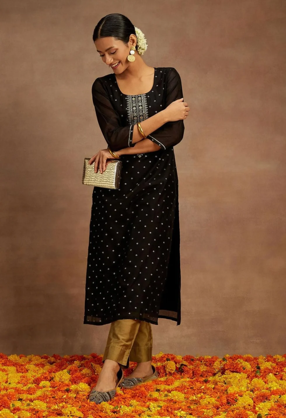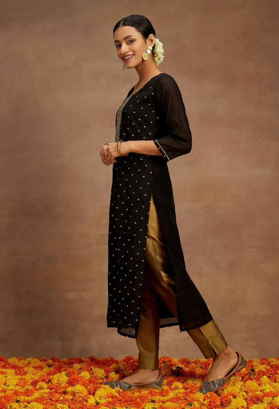 The Memsaab Black Chanderi Silk Straight Kurta features floral embroidery, sequinned detail, and a straight silhouette. Crafted from Chanderi silk, perfect for festive wear.