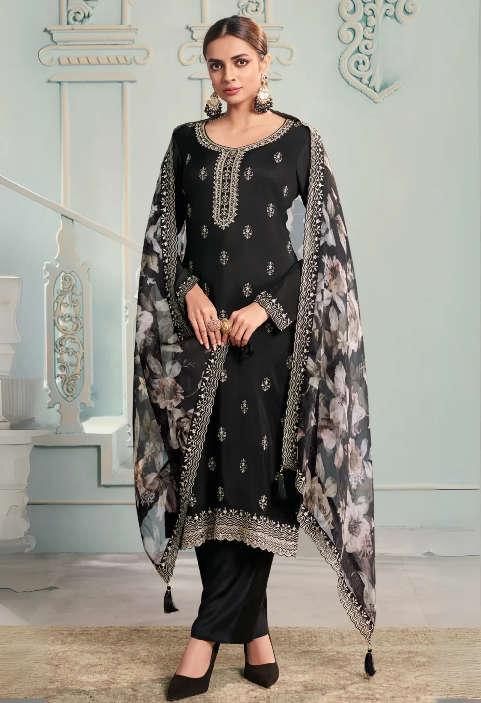 The Memsaab Black Embroidery Georgette Floral Kurta Set features intricate embroidery on moonga silk georgette, a santoon bottom, and a digitally printed organza dupatta with an embroidered border. Perfect for festive occasions.