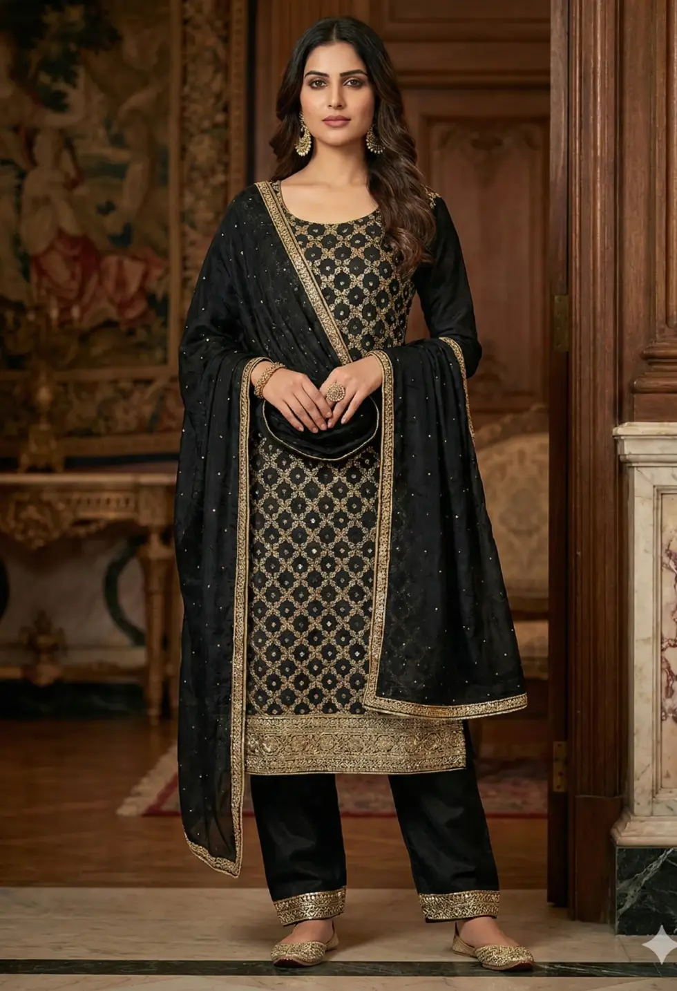 A classic black crepe suit set elevated with refined gold embroidery and a graceful, timeless silhouette.