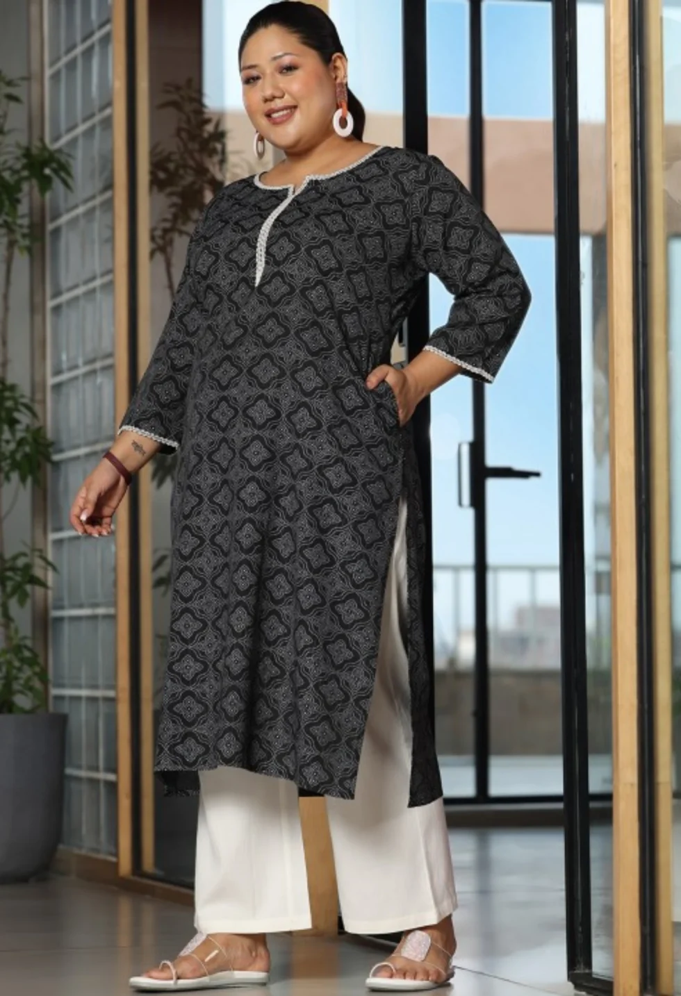 The Memsaab Black Plus Printed Kurta features ethnic motifs, a sweetheart neck, and three-quarter sleeves. Made from cotton, perfect for casual and semi-formal occasions.