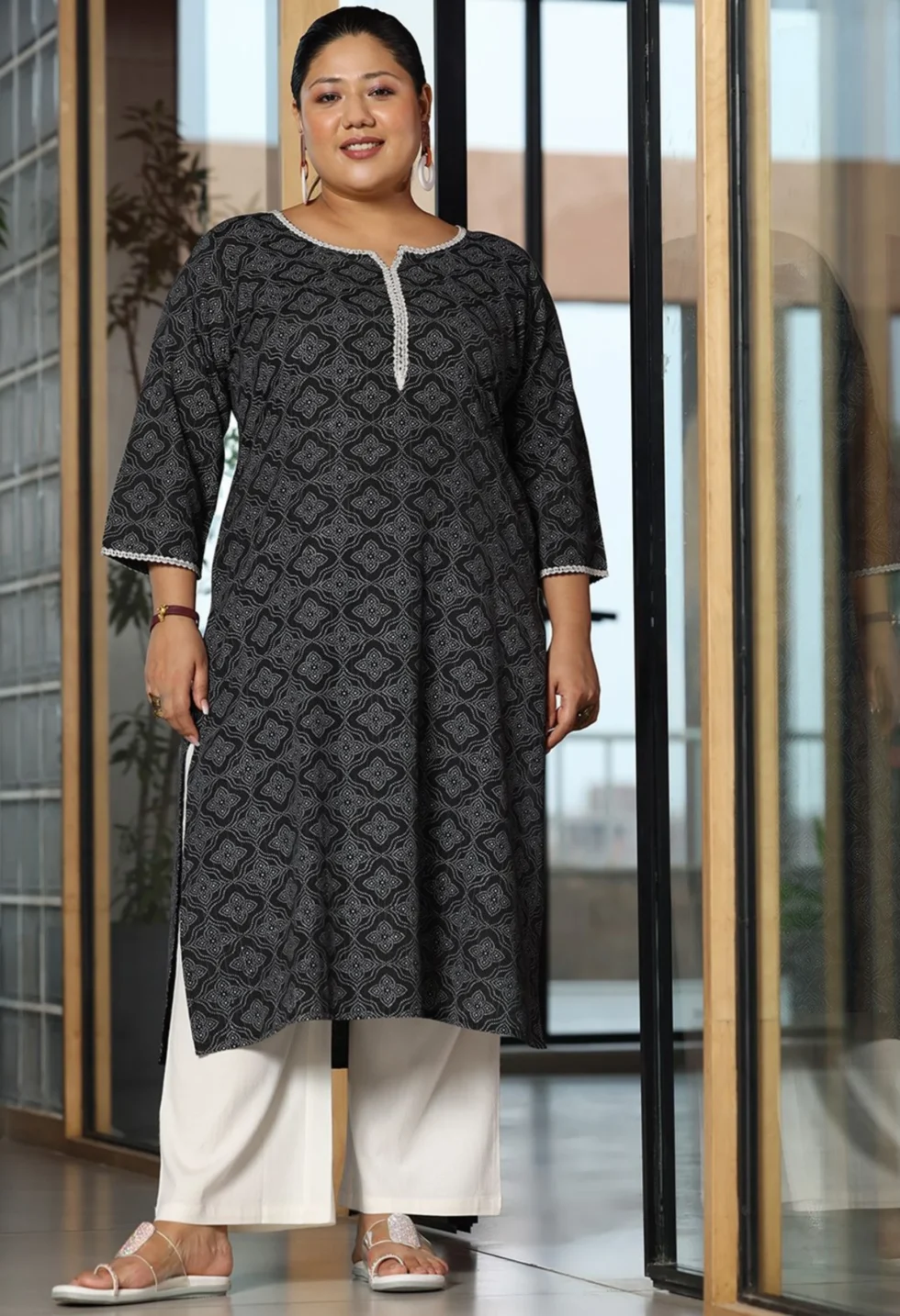 The Memsaab Black Plus Printed Kurta combines timeless style with everyday comfort. Featuring ethnic motifs and a flattering sweetheart neckline, this kurta is perfect for casual outings and semi-formal gatherings. Its plus-size fit ensures a relaxed yet chic look.