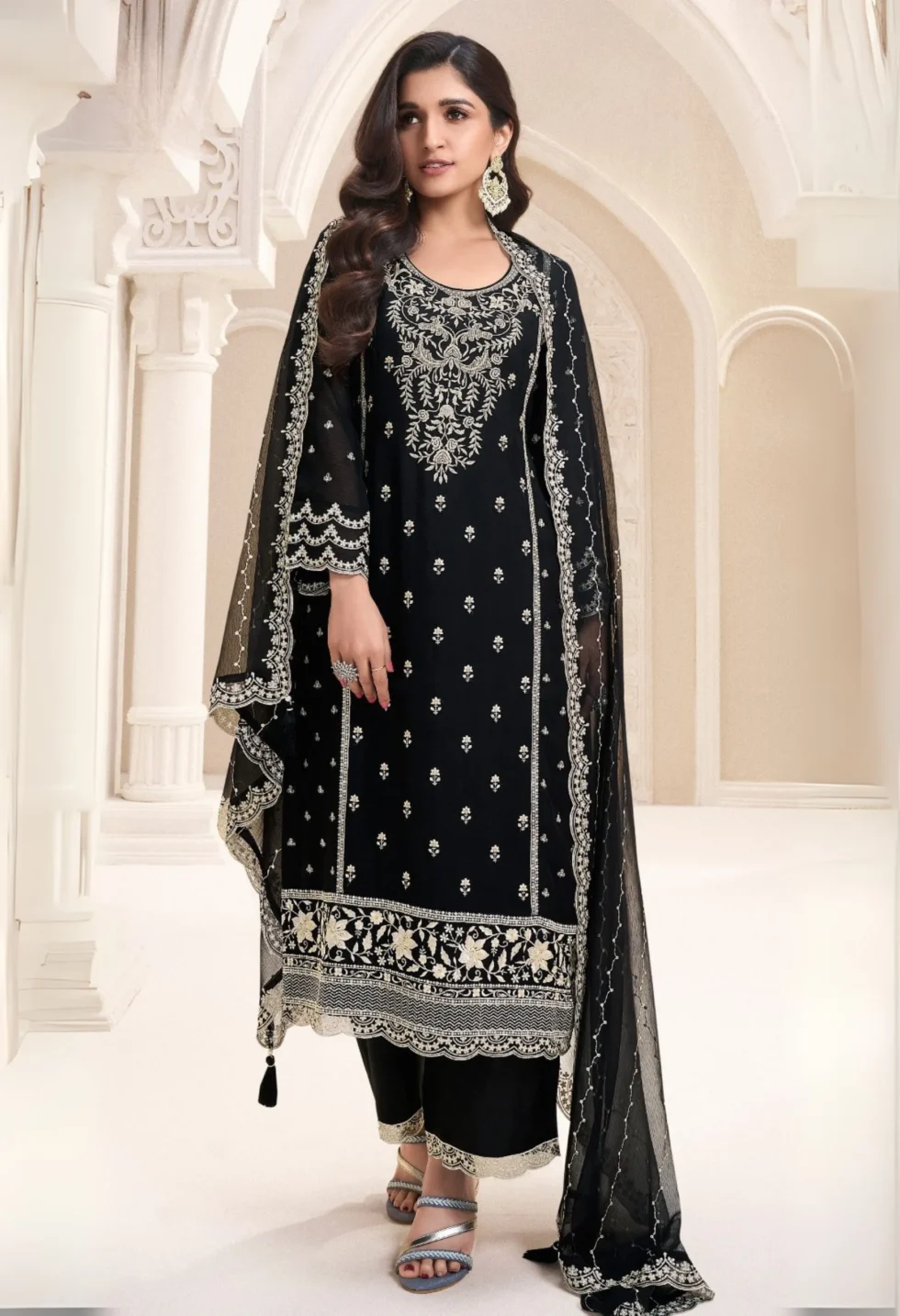 The Memsaab Black Royal Thread Embroidered Kurta Set offers striking contrast embroidery, flared bell sleeves, and a scalloped dupatta—designed for elegant festivities.