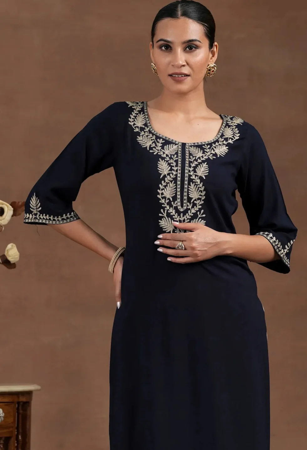 The Memsaab Blue and Gold-Toned Straight Kurta is a blend of elegance and tradition. Featuring a beautiful floral yoke design with intricate zari detailing, this kurta is crafted from premium viscose rayon for a smooth and comfortable fit. Its straight silhouette and gold-toned accents make it a perfect choice for festive and semi-formal occasions.