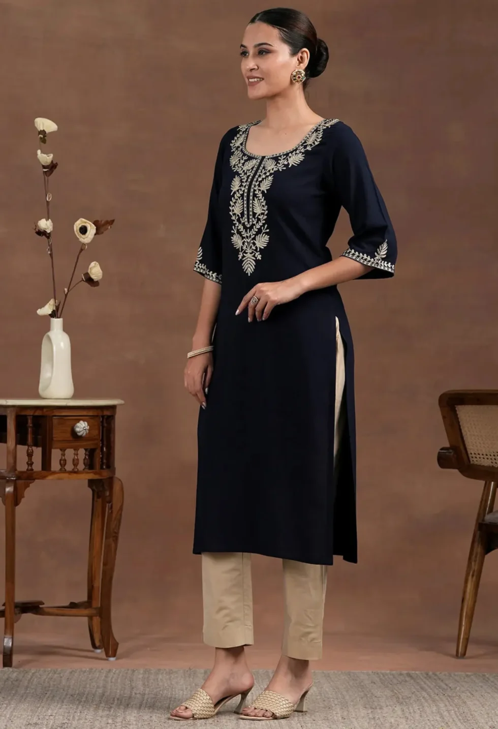 The Memsaab Blue and Gold-Toned Straight Kurta features a floral yoke design, zari detail, and a straight silhouette. Crafted from viscose rayon, perfect for festive and semi-formal wear.