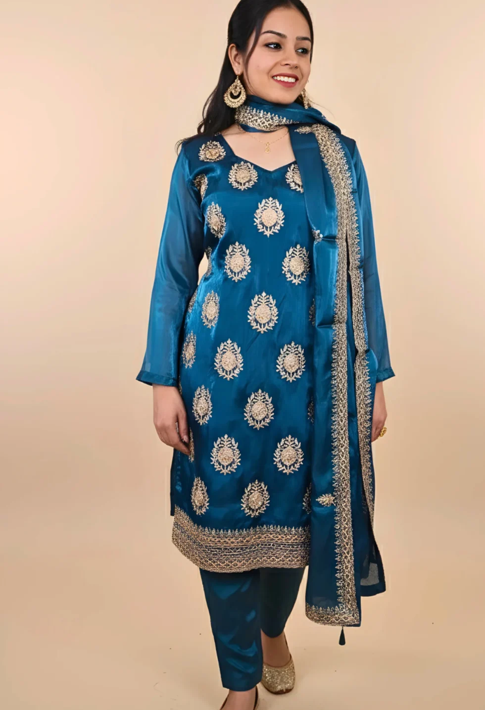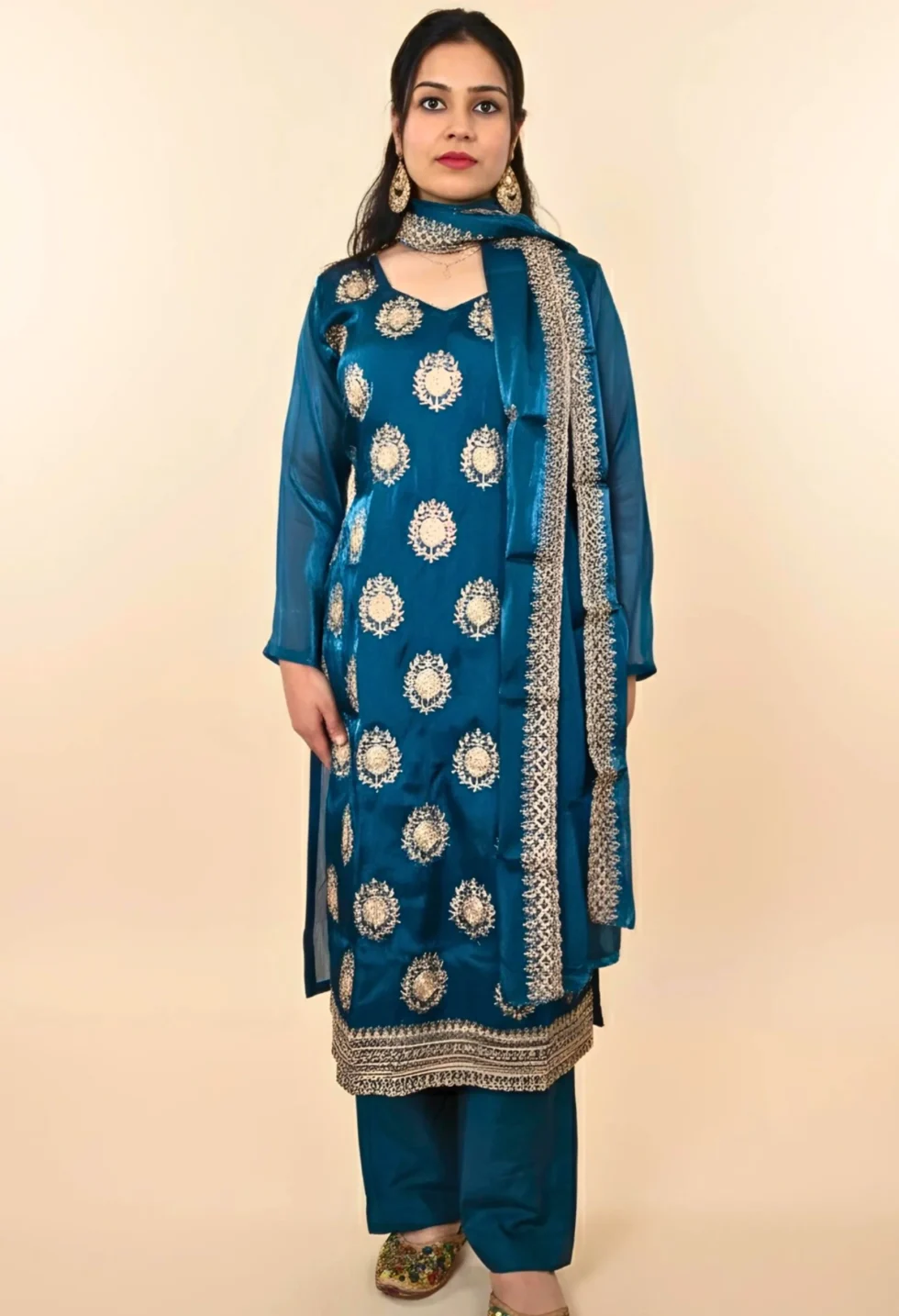 Memsaab Blue Golden Embroidered Kurta Set with chiffon dupatta — floral embroidery, scalloped border, crape fabric with mul cotton lining, and premium finish.