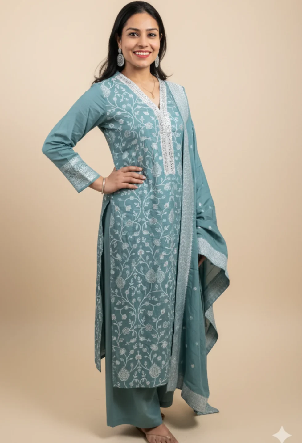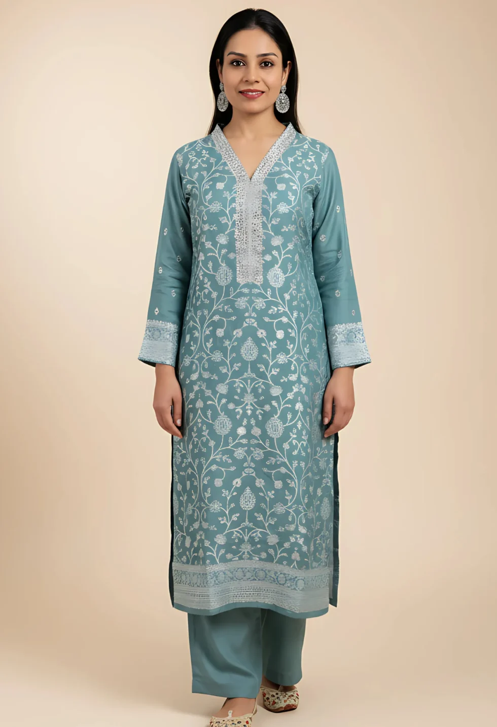Memsaab Blue Silk Kurta Set with chiffon dupatta — elegant embroidery, scalloped border, and premium fabrics for weddings and festive occasions.