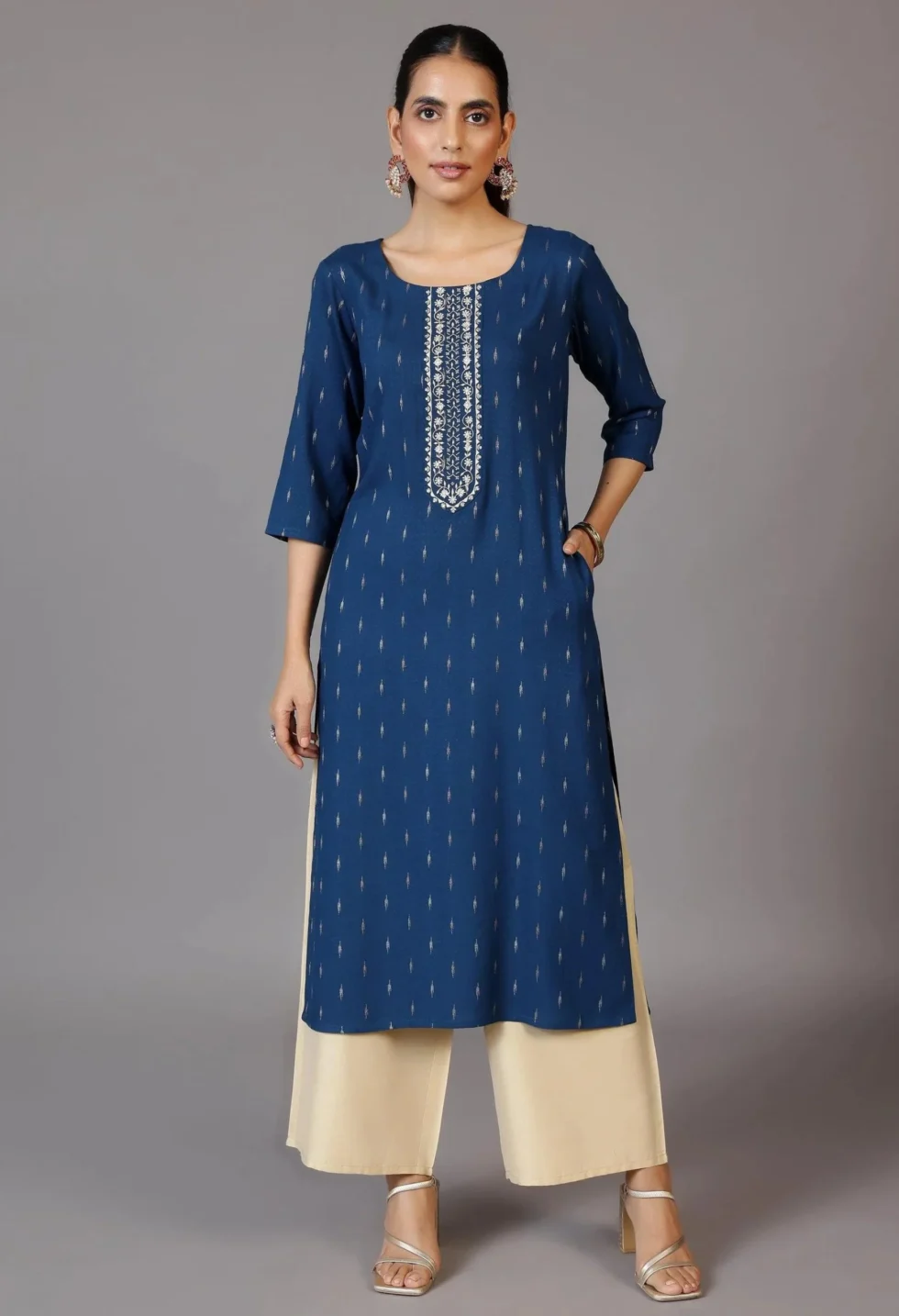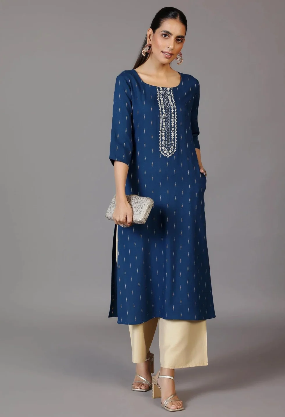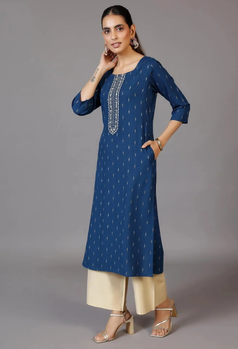 Introducing the Memsaab Blue Woven Design Cotton Straight Kurta, a perfect blend of comfort and style for your daily wear. This kurta features a classic straight shape, crafted from soft and breathable cotton with a woven yoke design that adds a touch of elegance. The kurta has a round neck, three-quarter sleeves, and a calf-length hemline, making it a versatile choice for everyday use. Side slits provide ease of movement, while the rich blue color adds a pop of vibrancy to your wardrobe.