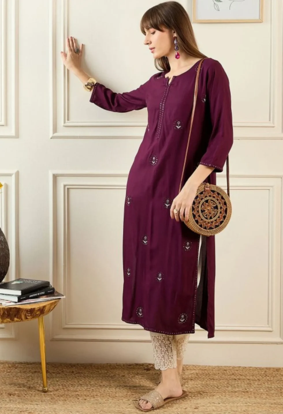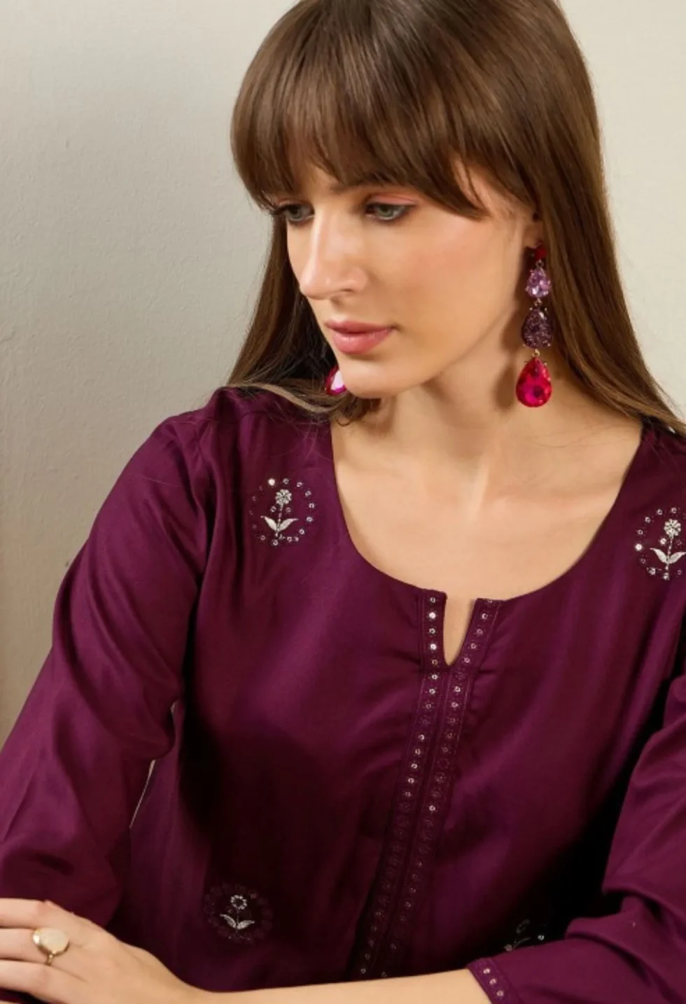 The Memsaab Burgundy Embroidered Notch Neck Sequins Kurta features ethnic embroidery, sequinned details, a notch neck, and three-quarter sleeves. Made from viscose rayon, ideal for festive occasions.