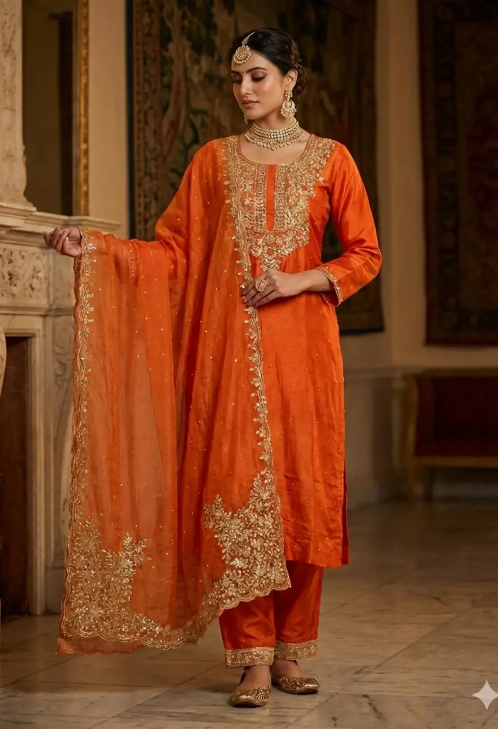 A striking burnt orange crape kurta set adorned with rich zari embroidery, paired with coordinated bottoms and an ornate festive dupatta.