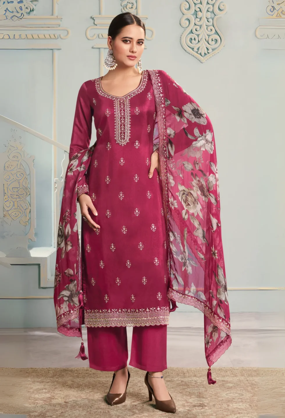 The Memsaab Cherry Embroidery Georgette Floral Kurta Set is a sophisticated and graceful ensemble perfect for special occasions. Featuring intricate embroidery on a silk georgette fabric, paired with a luxurious santoon bottom and a digital printed organza dupatta with an embroidered border, this set offers unmatched elegance.