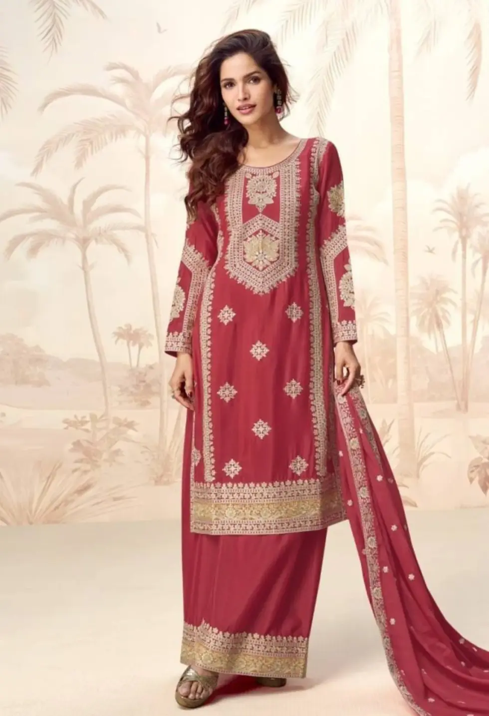 A regal crimson sharara set crafted in silk shimmer, richly embroidered with heritage motifs and paired with a graceful flowing dupatta.