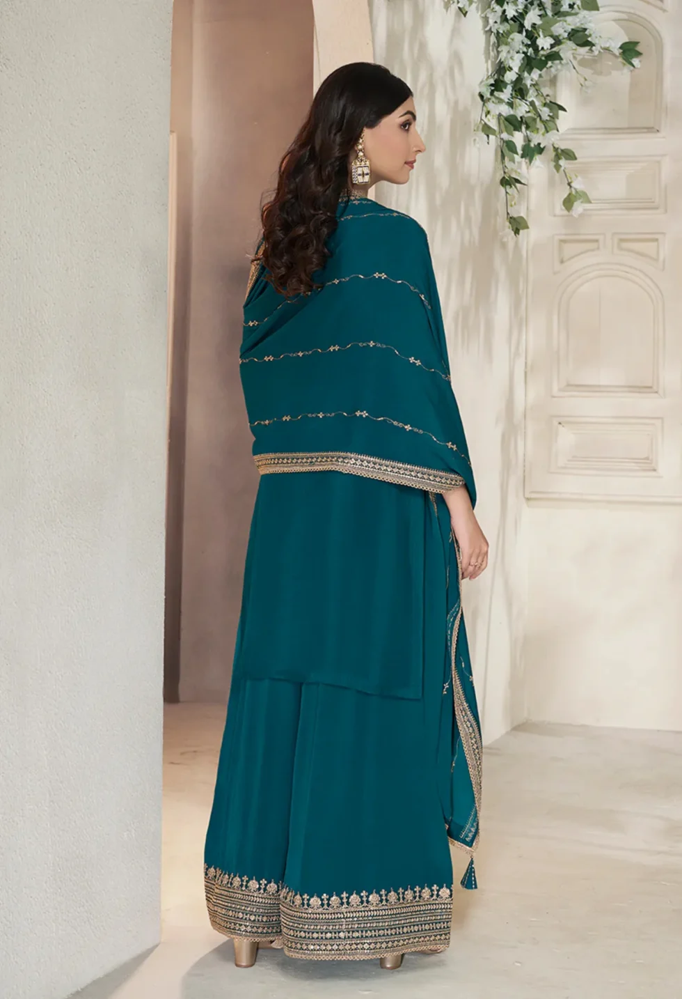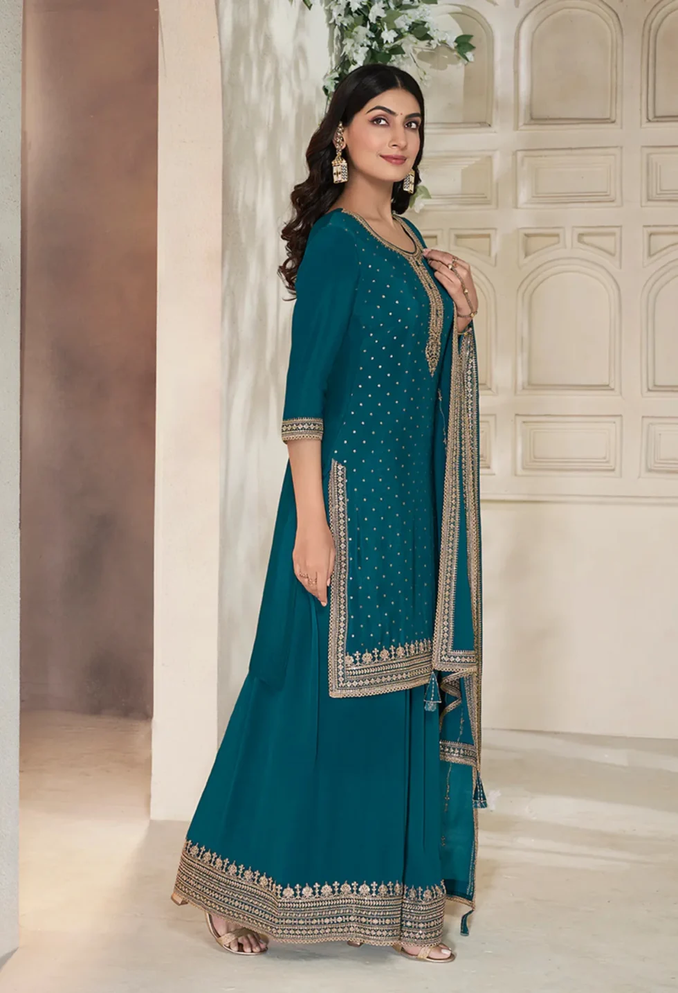 The Memsaab Dark Blue Sharara Suit NZ is a statement outfit for modern women who want to celebrate tradition in style. Adorned with fine sequins and thread hand embroidery, this rich chinon ensemble is perfect for festive evenings, weddings, and grand cultural events.