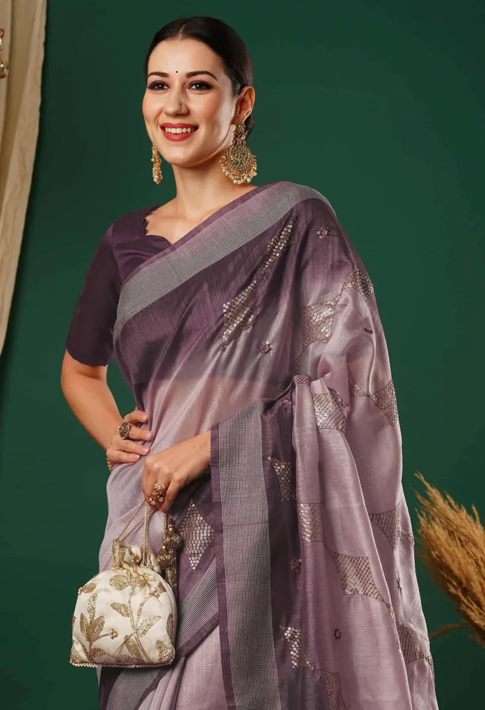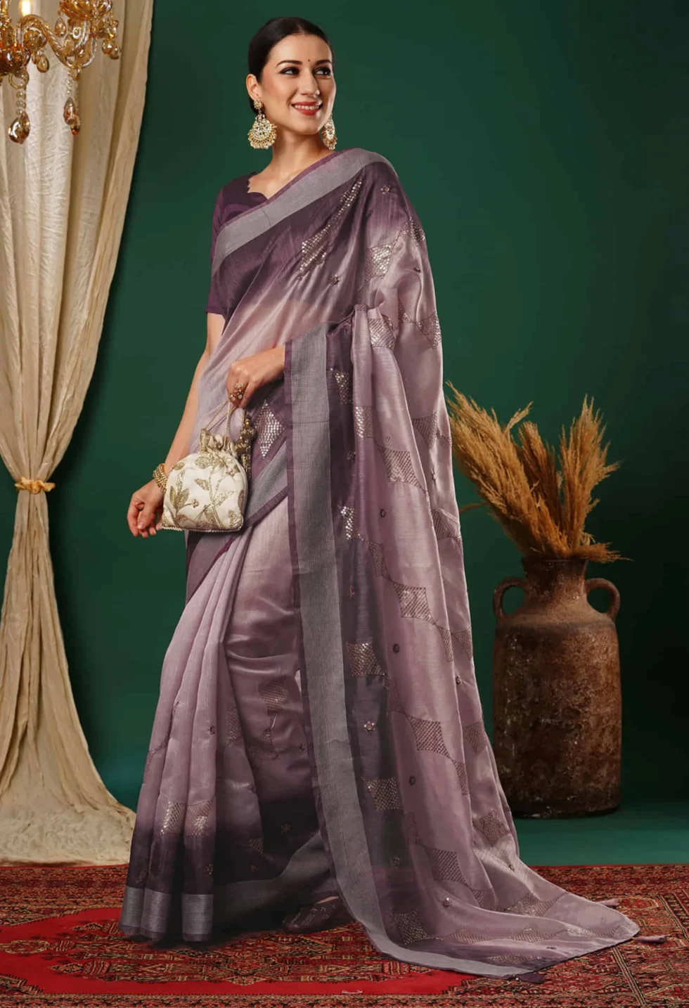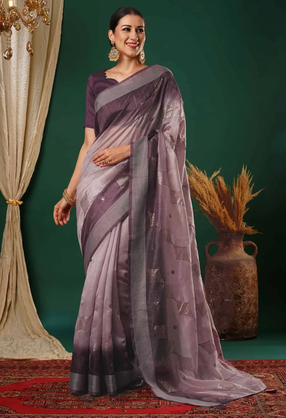 A delicate dusty lavender silk blend saree featuring intricate sequin embroidery and a contrast dark purple blouse—ideal for festive and elegant occasions.