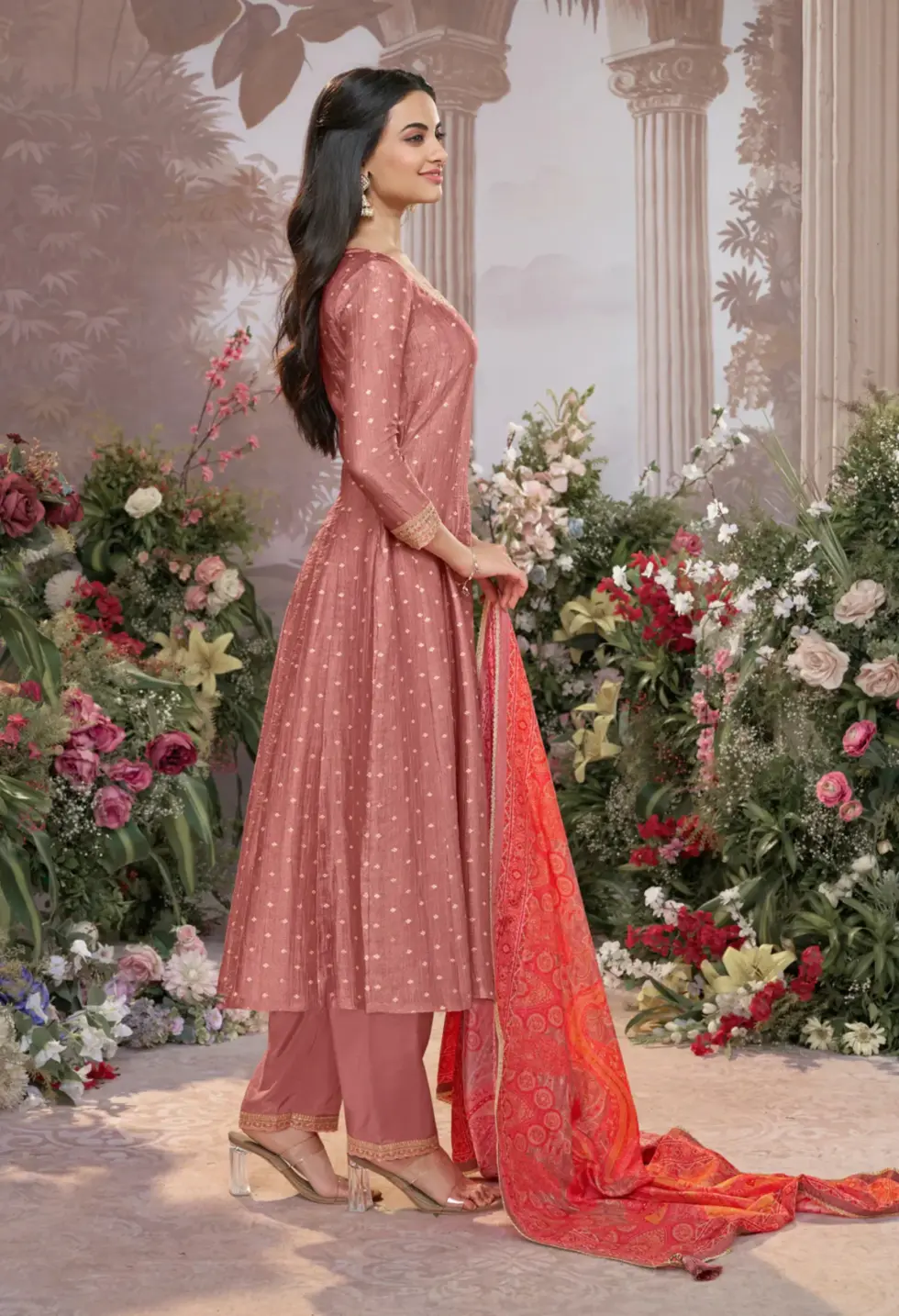 Memsaab Dusty Rose Tissue Silk Anarkali Suit Set with contrast Russian silk dupatta — heavy embroidery, graceful flare, and premium festive detailing.