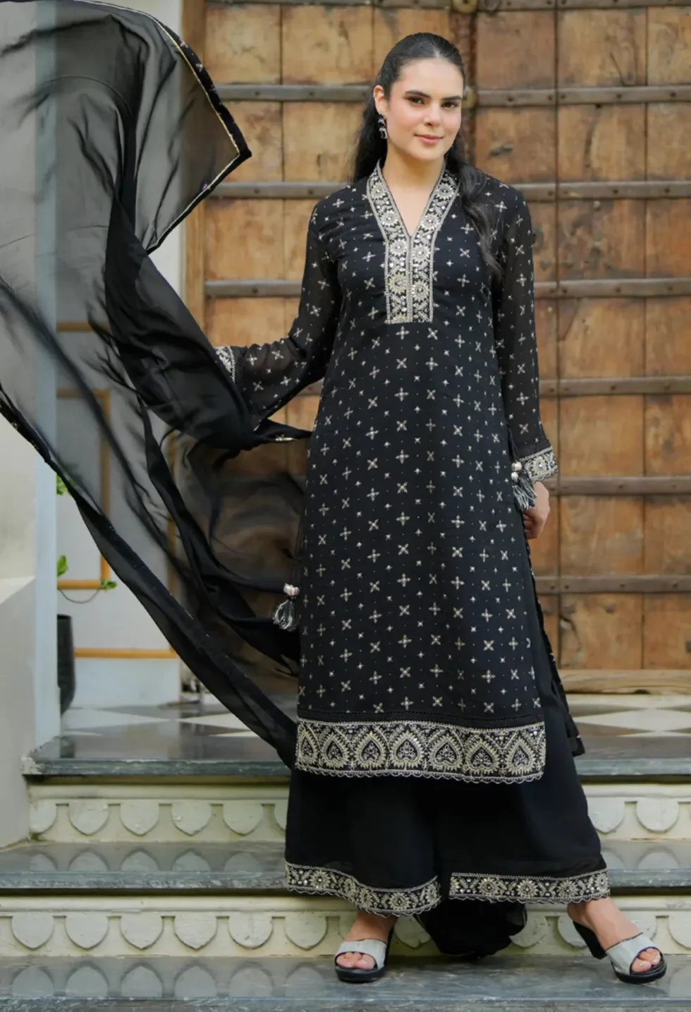 Create a statement with the Memsaab Elegant Black Georgette Salwar Set—a true blend of tradition and flair. Add it to your wardrobe today and redefine your festive style.