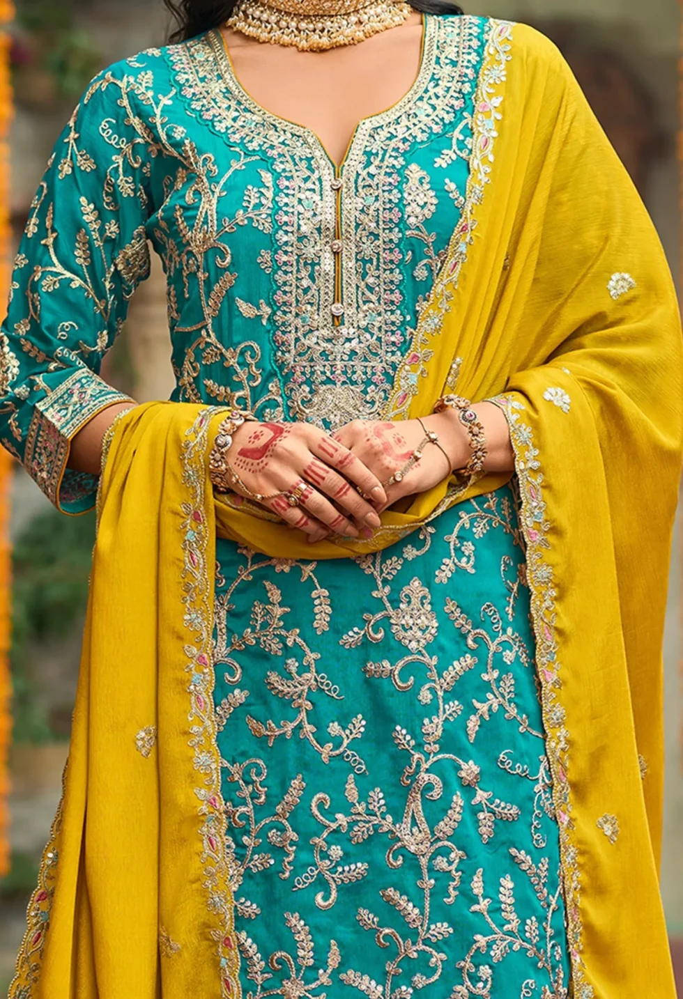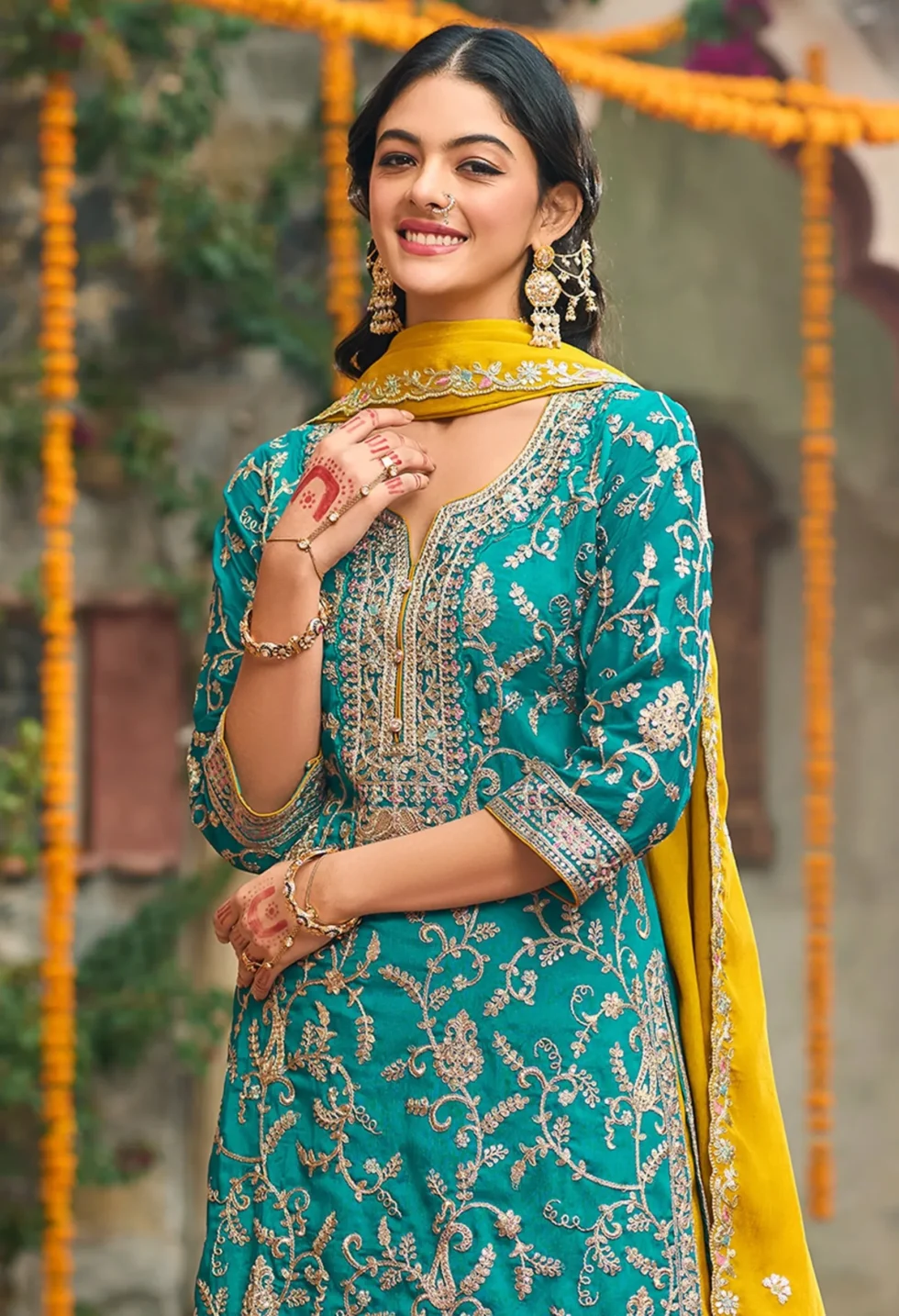 Celebrate elegance in the Memsaab Blue Embroidered Silk Kurta Set, crafted with fine detailing, matching trousers, and a graceful dupatta — perfect for festive occasions.