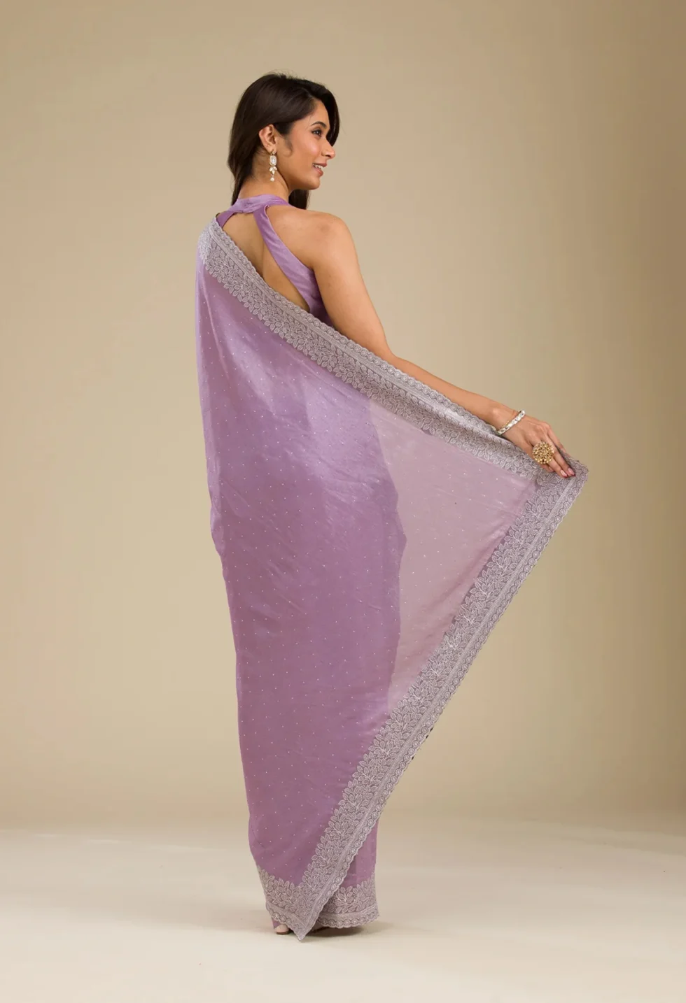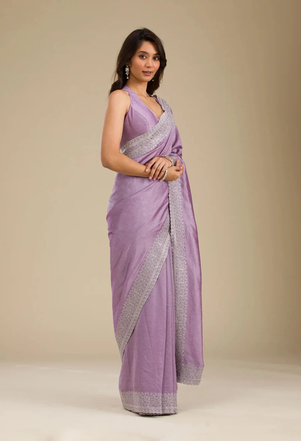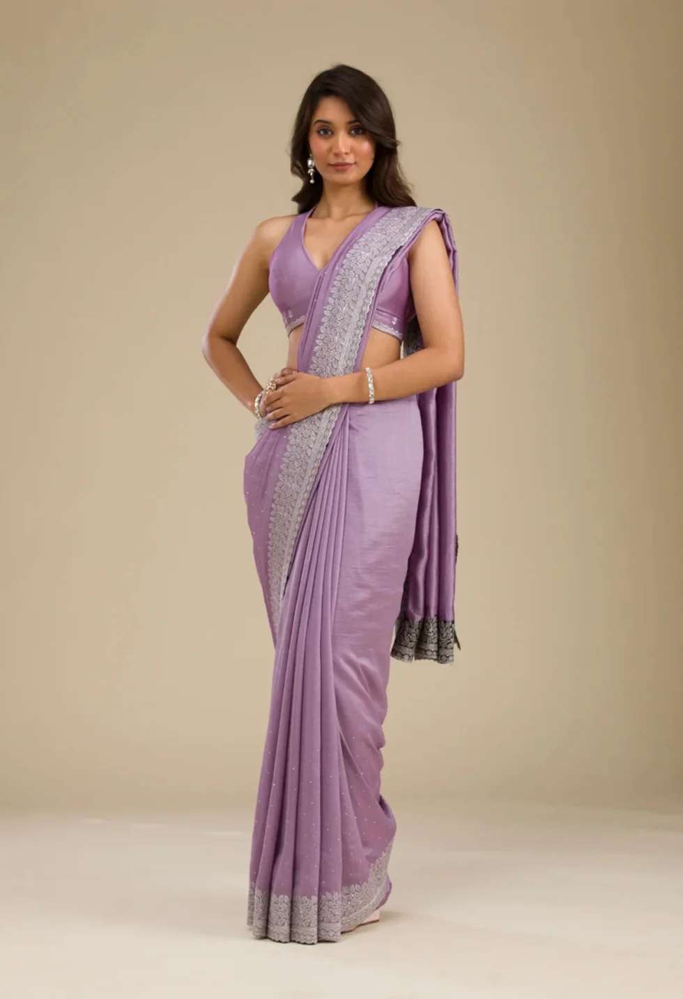 Drape elegance with Memsaab’s soft silk saree in regal purple—shimmering with delicate silver zariwork for a timeless festive look.
