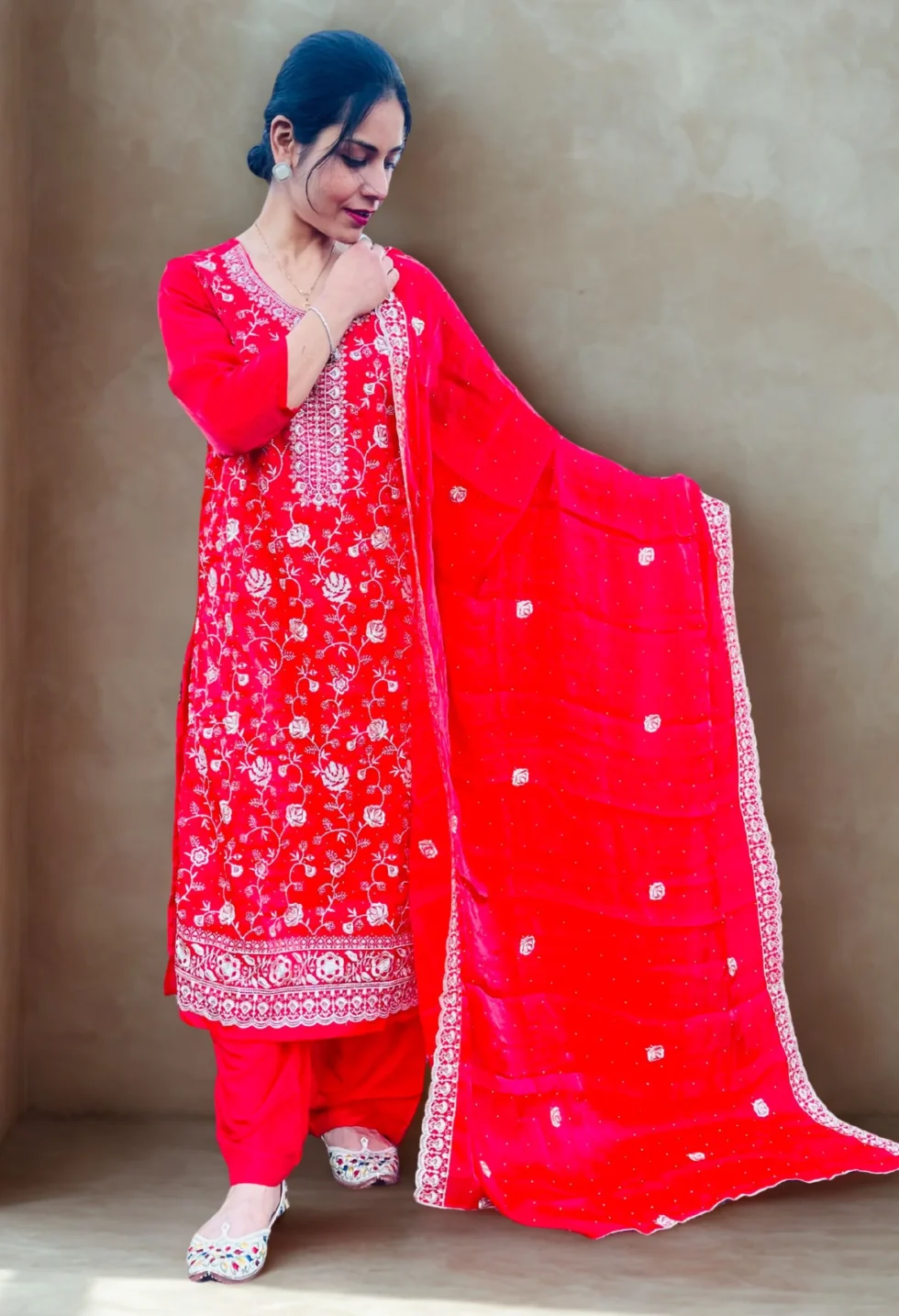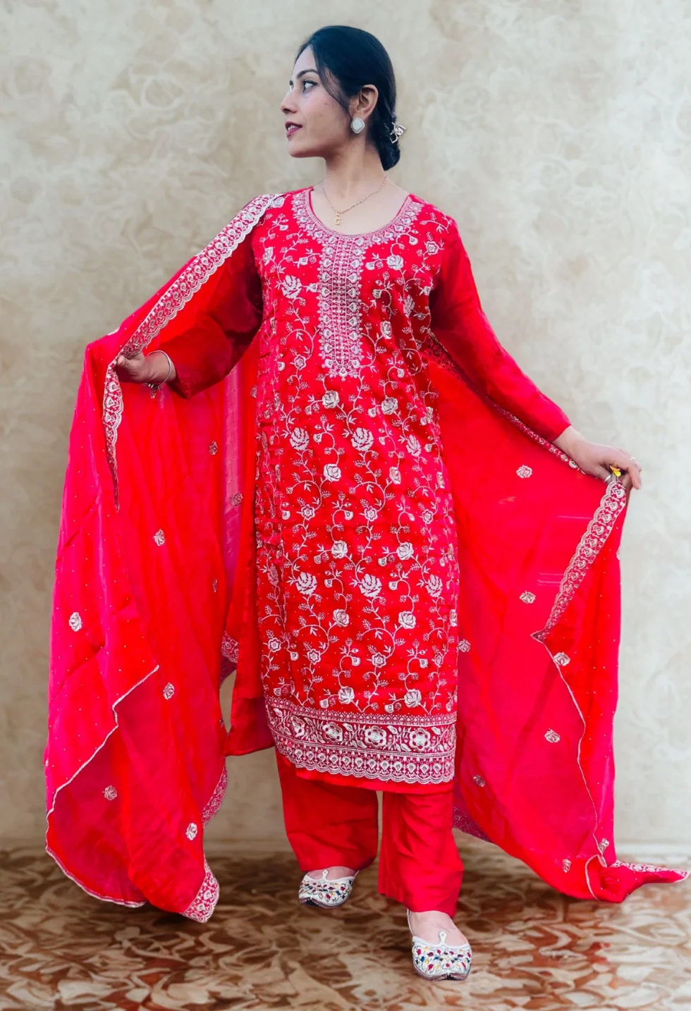 Feel the emotional connection to Indian traditions with every wear—the red silk palazzo suit isn’t just attire; it’s a celebration of culture and craftsmanship. Perfect for festive events or gifting to loved ones.