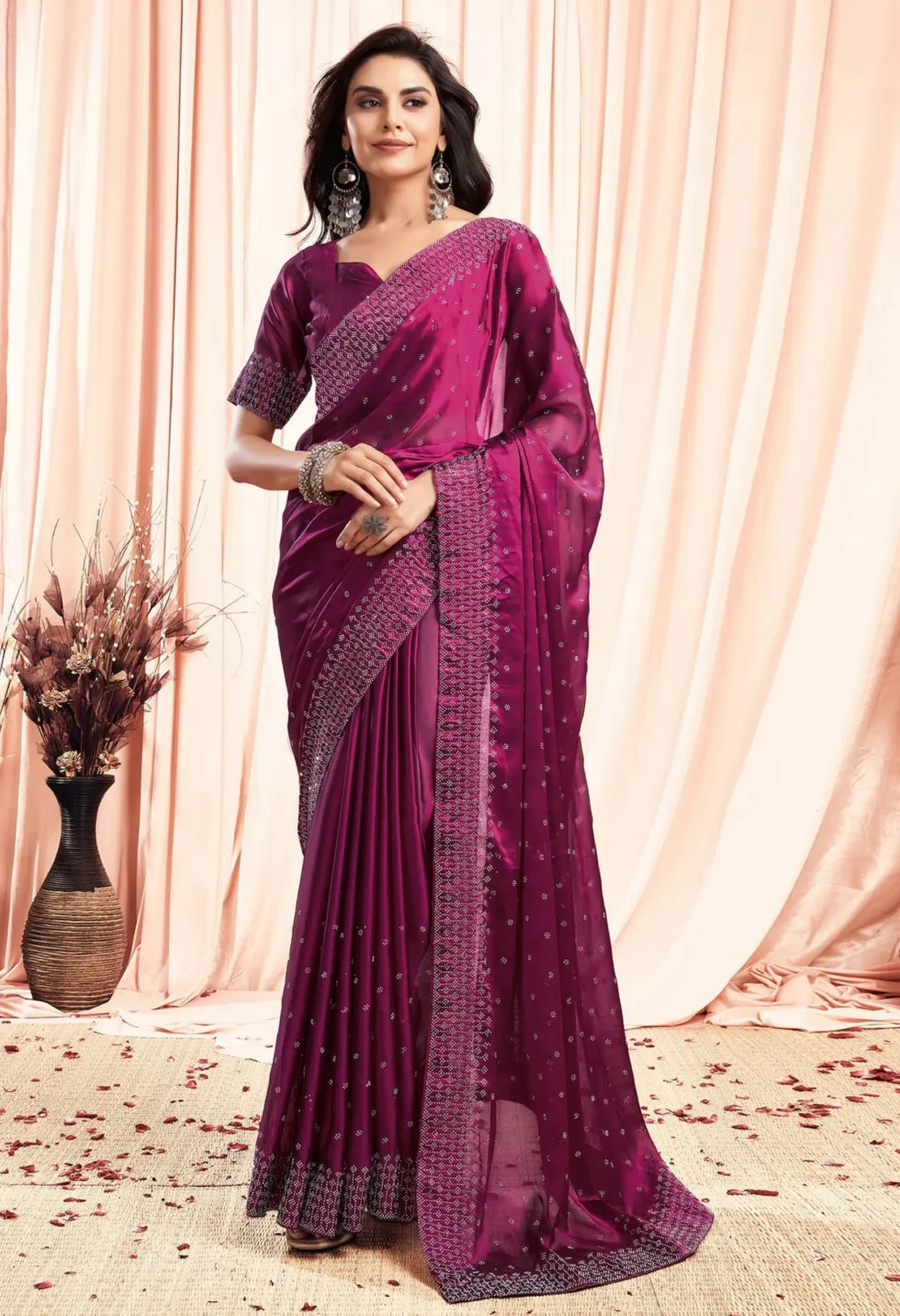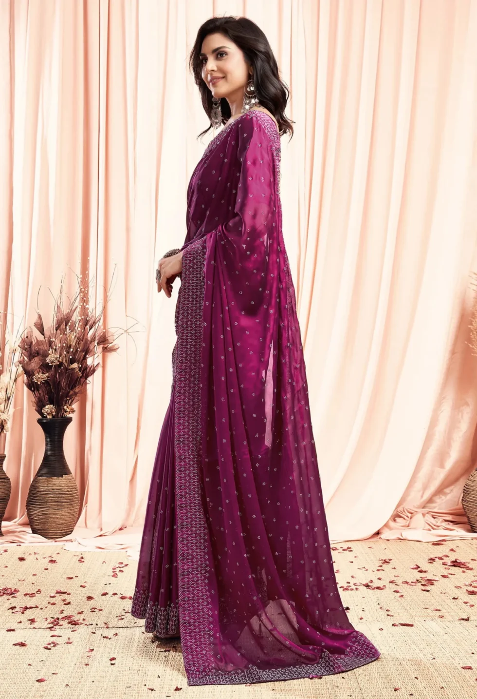 A stunning dark pink Swarovski georgette saree featuring subtle hot fixing and a matching plain blouse—perfect for creating a graceful party look.