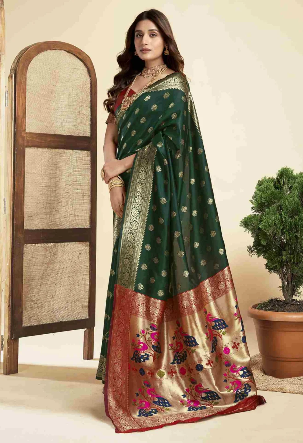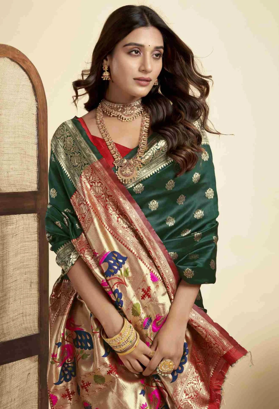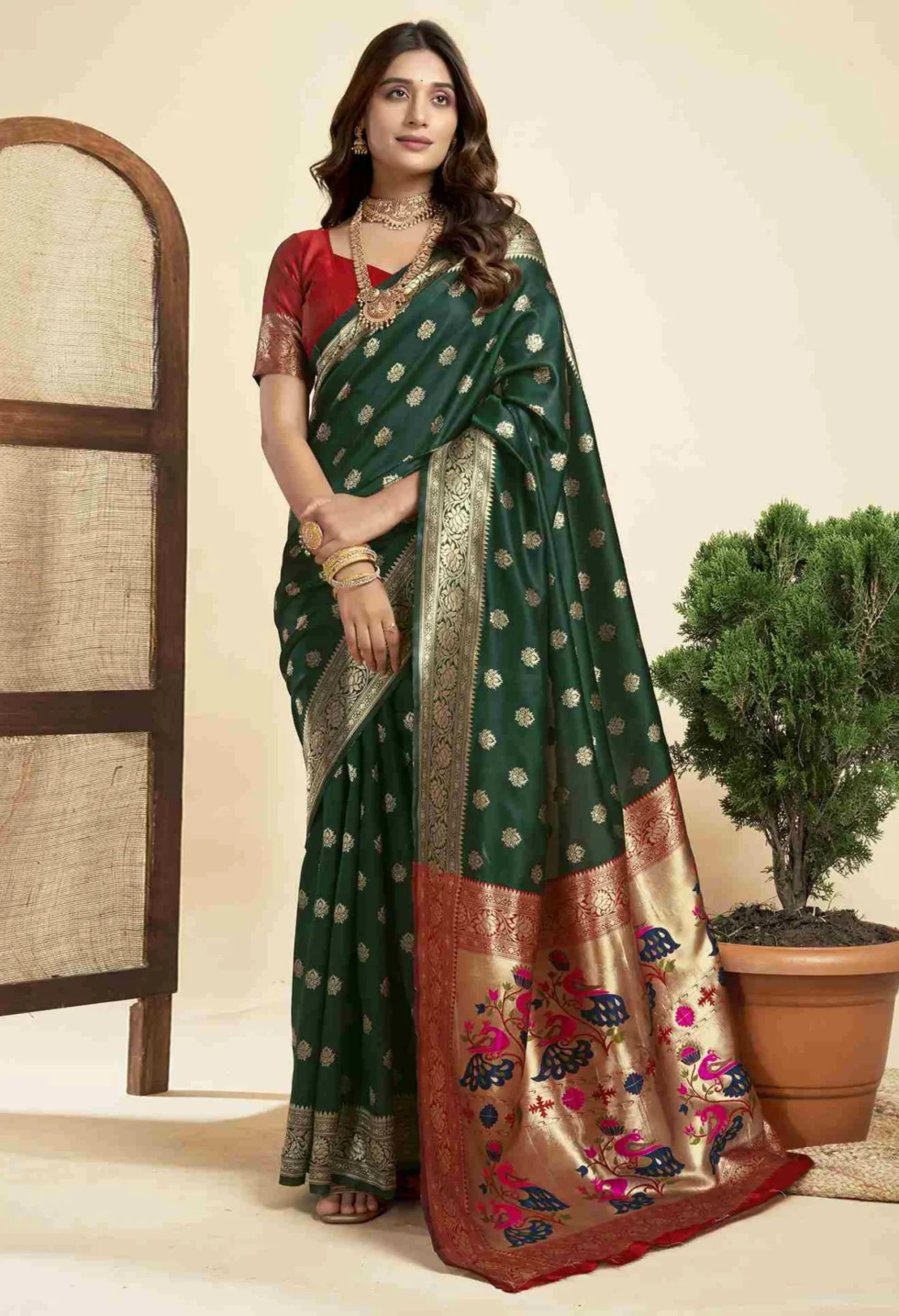 Elegant dark green Paithani saree with red and golden woven motifs, featuring a silk blend base and unstitched red blouse—ideal for festive and wedding wear.