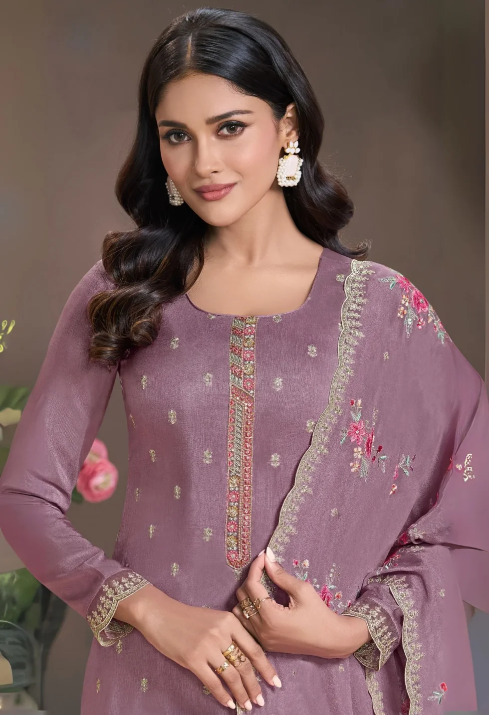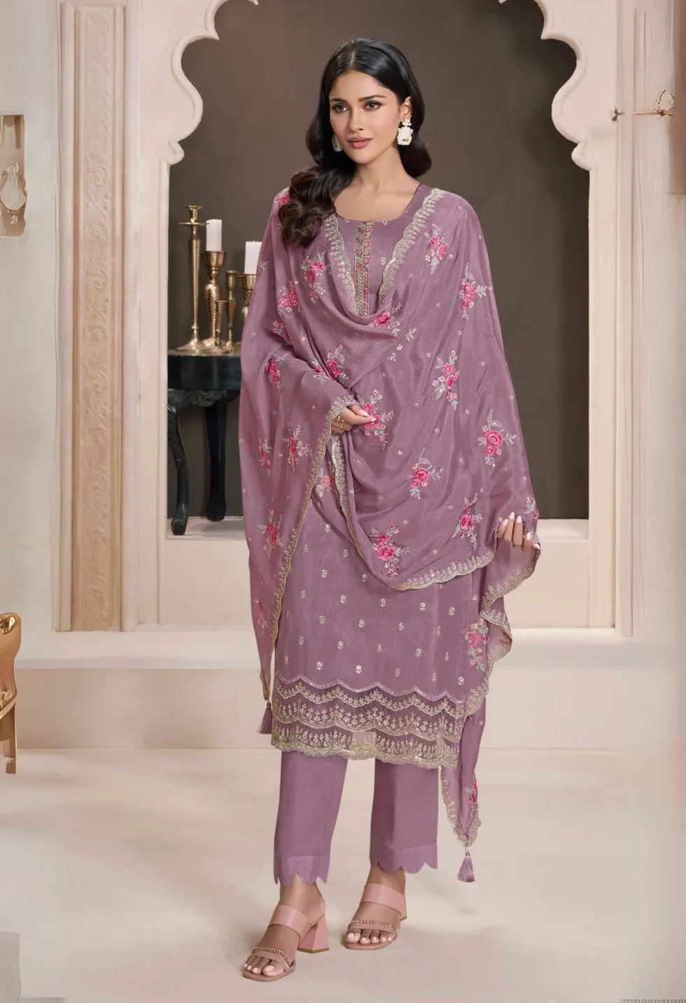 Feel the emotional connection to Indian traditions with every wear—the lavender embroidered silk palazzo suit isn’t just attire; it’s a celebration of culture and craftsmanship. Perfect for festive events or gifting to loved ones.