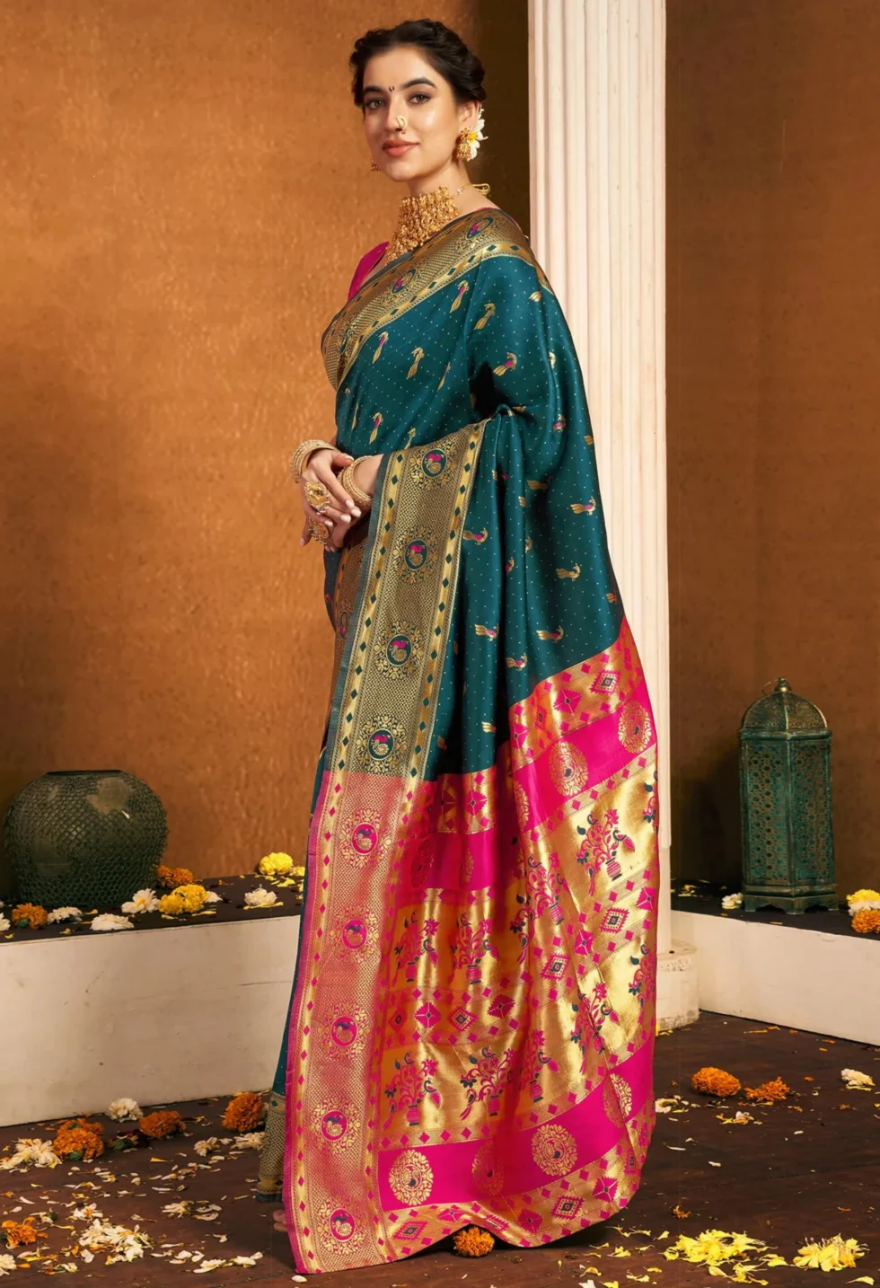 Memsaab Graceful Rama Blue Paithani Silk Saree with Woven Borders and Matching Unstitched Blouse – a festive classic from India.