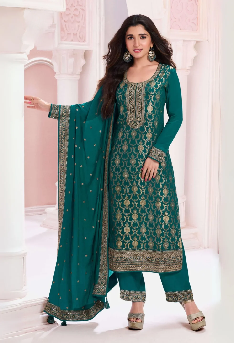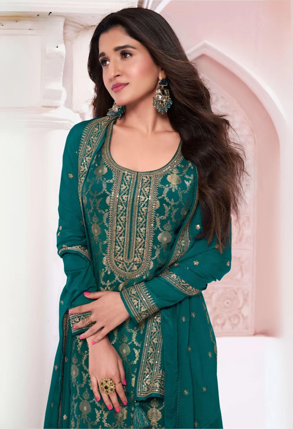 The Memsaab Green Embroidered Silk Suit Set features a straight Dola silk kurta with floral jacquard and sequins embroidery, santoon pants, and a silk chiffon dupatta. Ideal for weddings and festive events.