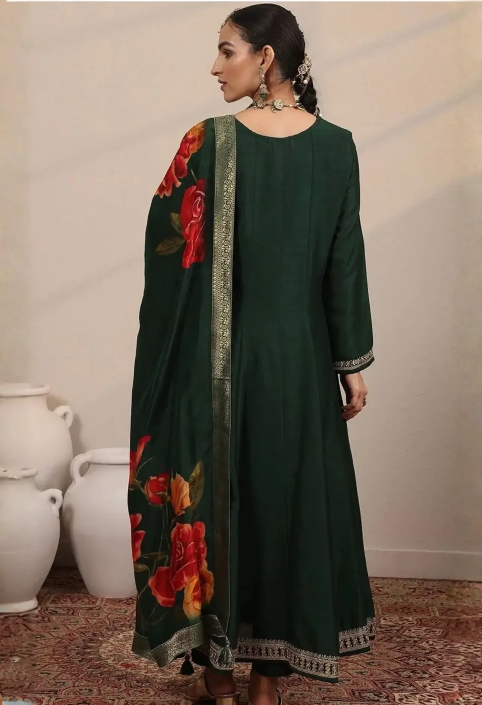 Elegant green and gold Anarkali set crafted in silk blend with intricate embroidery.