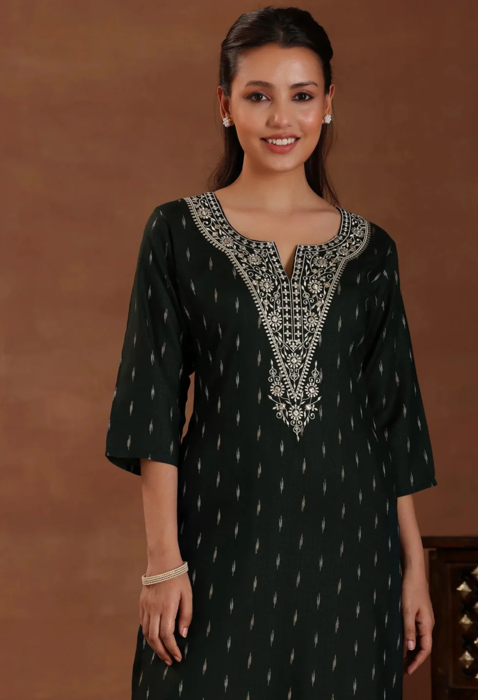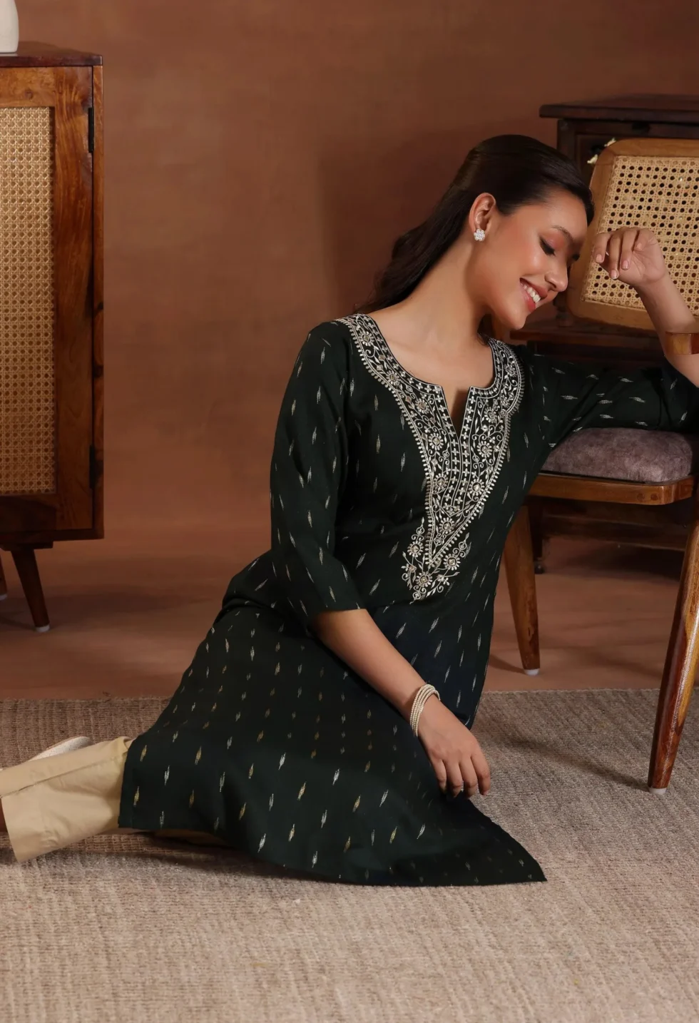 The Memsaab Green Notched Neck Zari Kurta is a graceful and versatile addition to your wardrobe. Featuring ethnic motifs with zari detailing, this kurta blends traditional charm with modern design. Crafted from dobby cotton, it is perfect for casual and festive occasions.