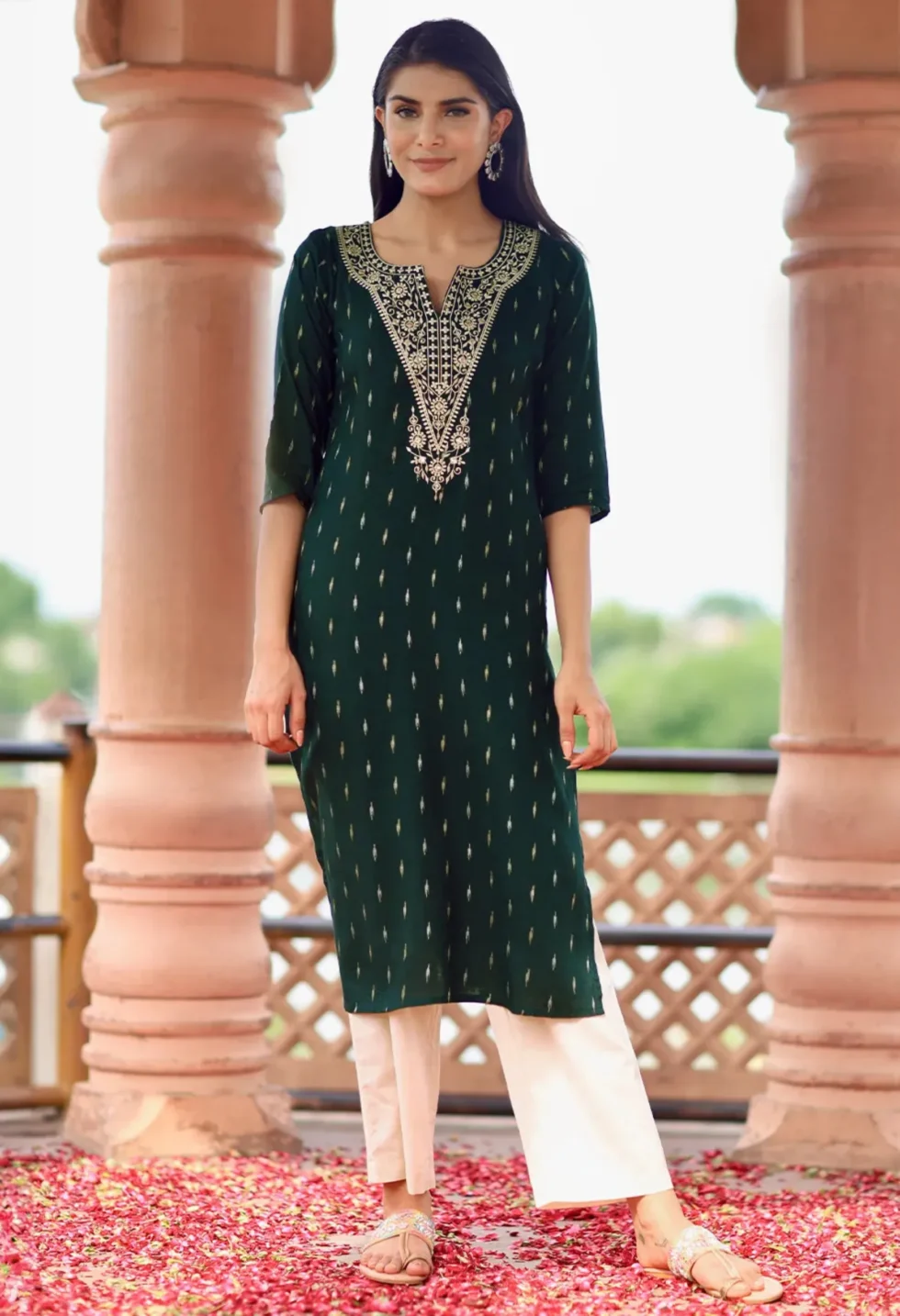 The Memsaab Green Notched Neck Zari Kurta features ethnic motifs, zari detailing, and a notched neck. Made from dobby cotton, perfect for casual and festive occasions.
