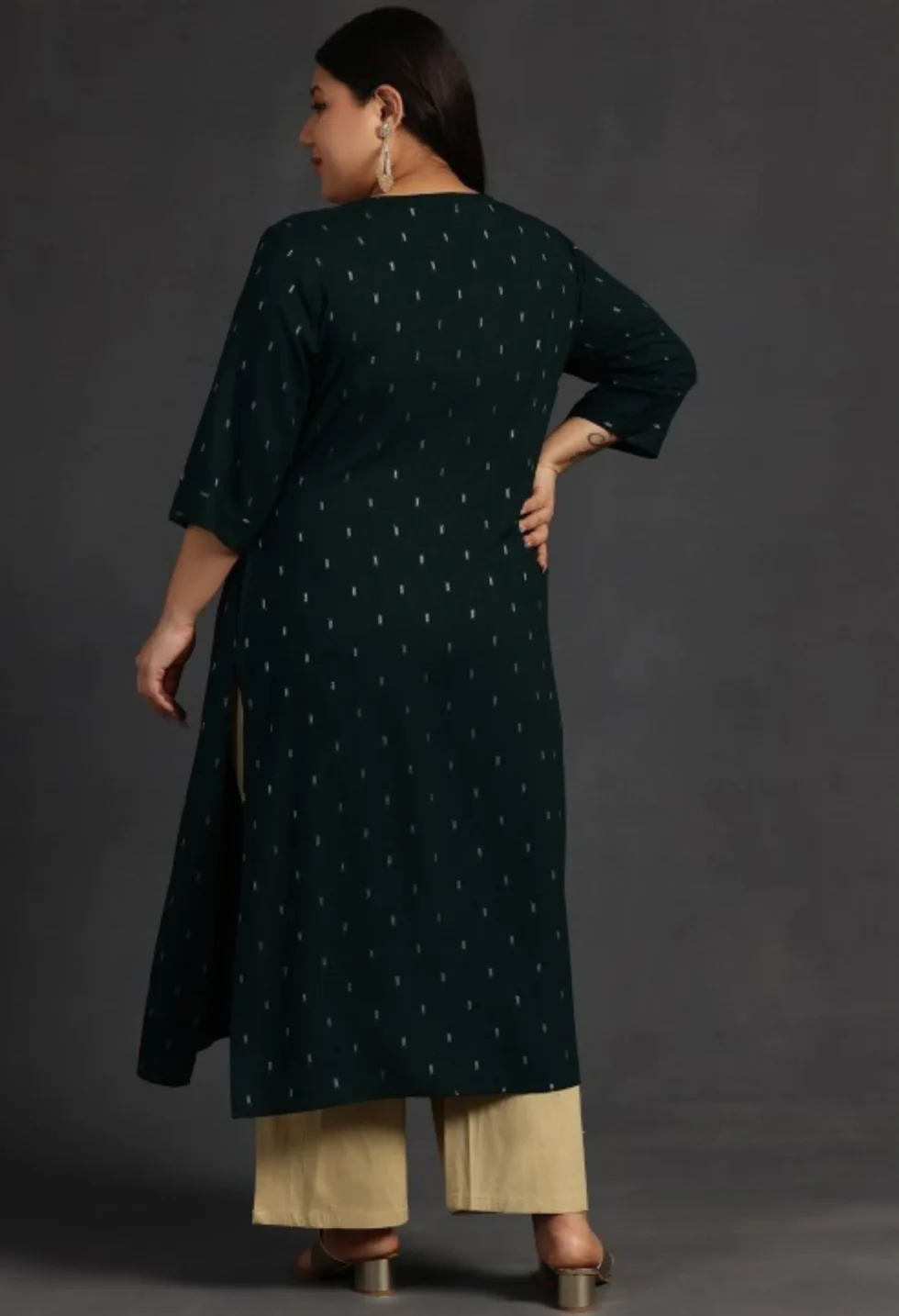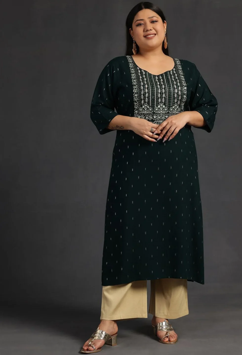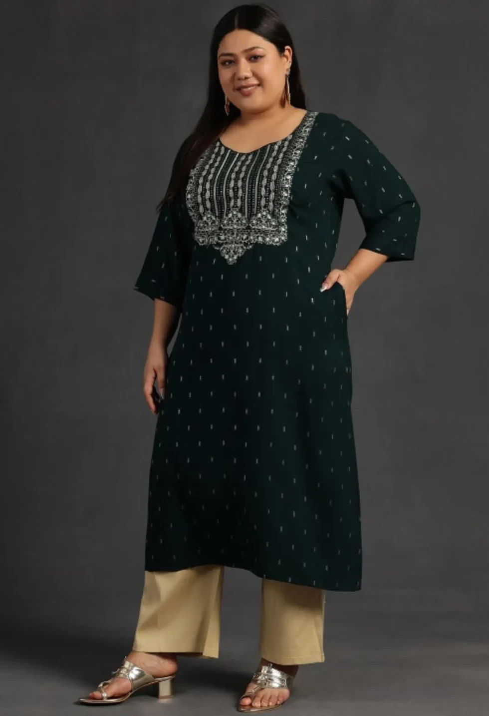 The Memsaab Green Thread Work Dobby Straight Kurta features a floral yoke design, round neck, and three-quarter sleeves. Made from viscose rayon, it’s perfect for casual and festive occasions.