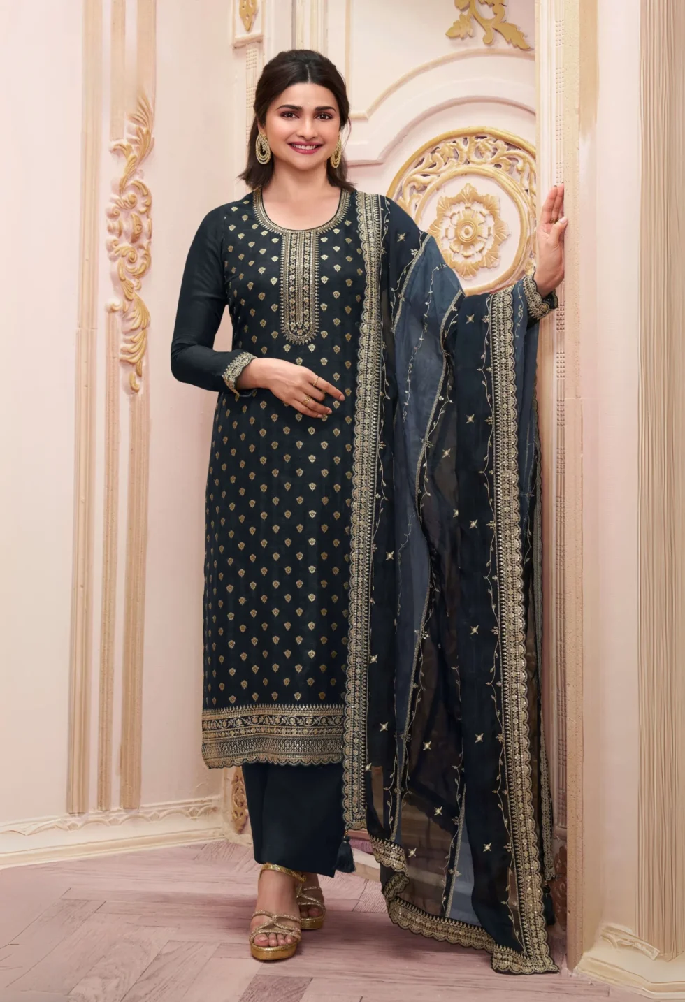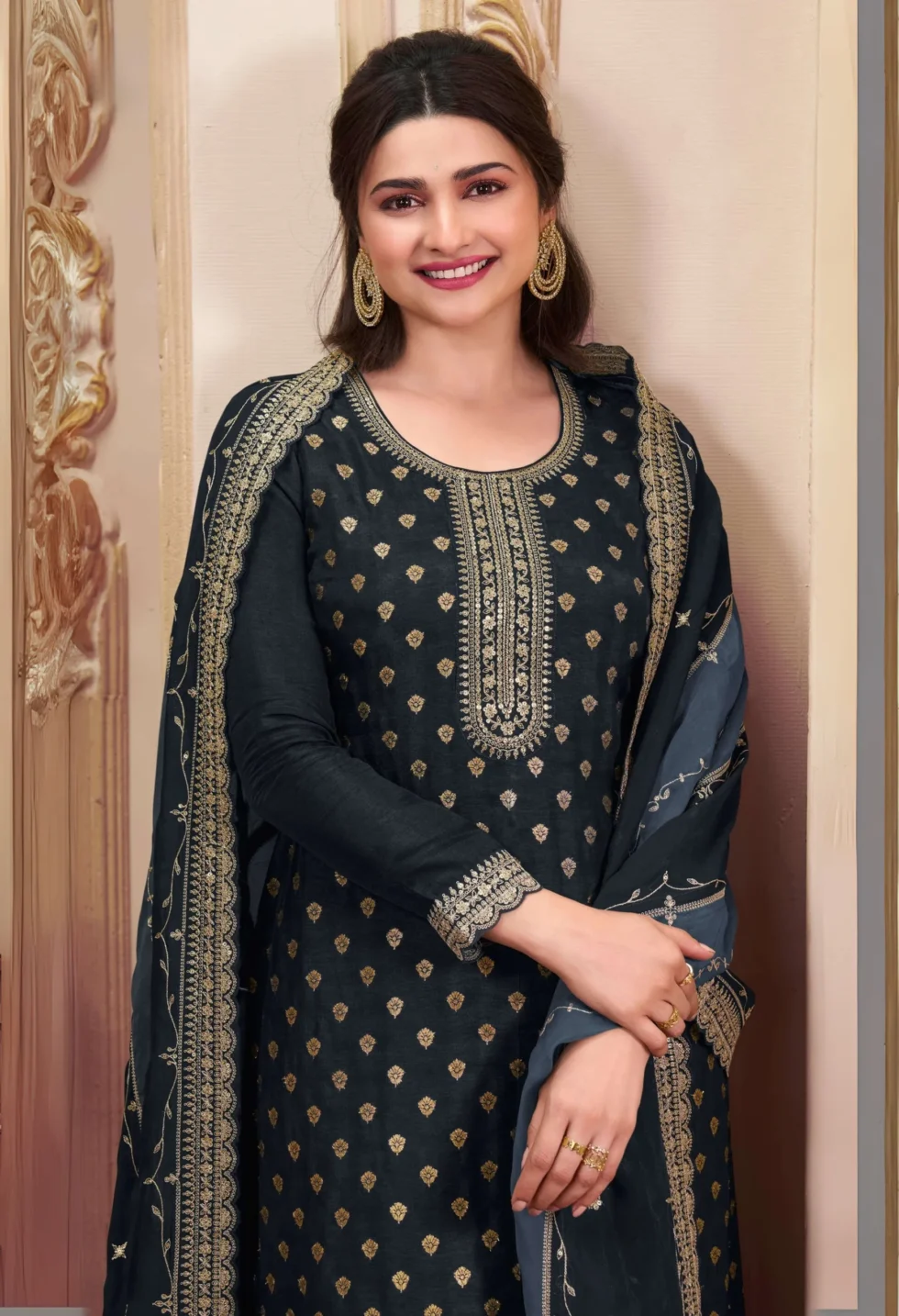 The Memsaab Grey Black Dola Jacquard Sequined Kurta Set features an embroidered straight kurta, solid santoon pants, and a scalloped organza dupatta. A perfect pick for festive elegance.