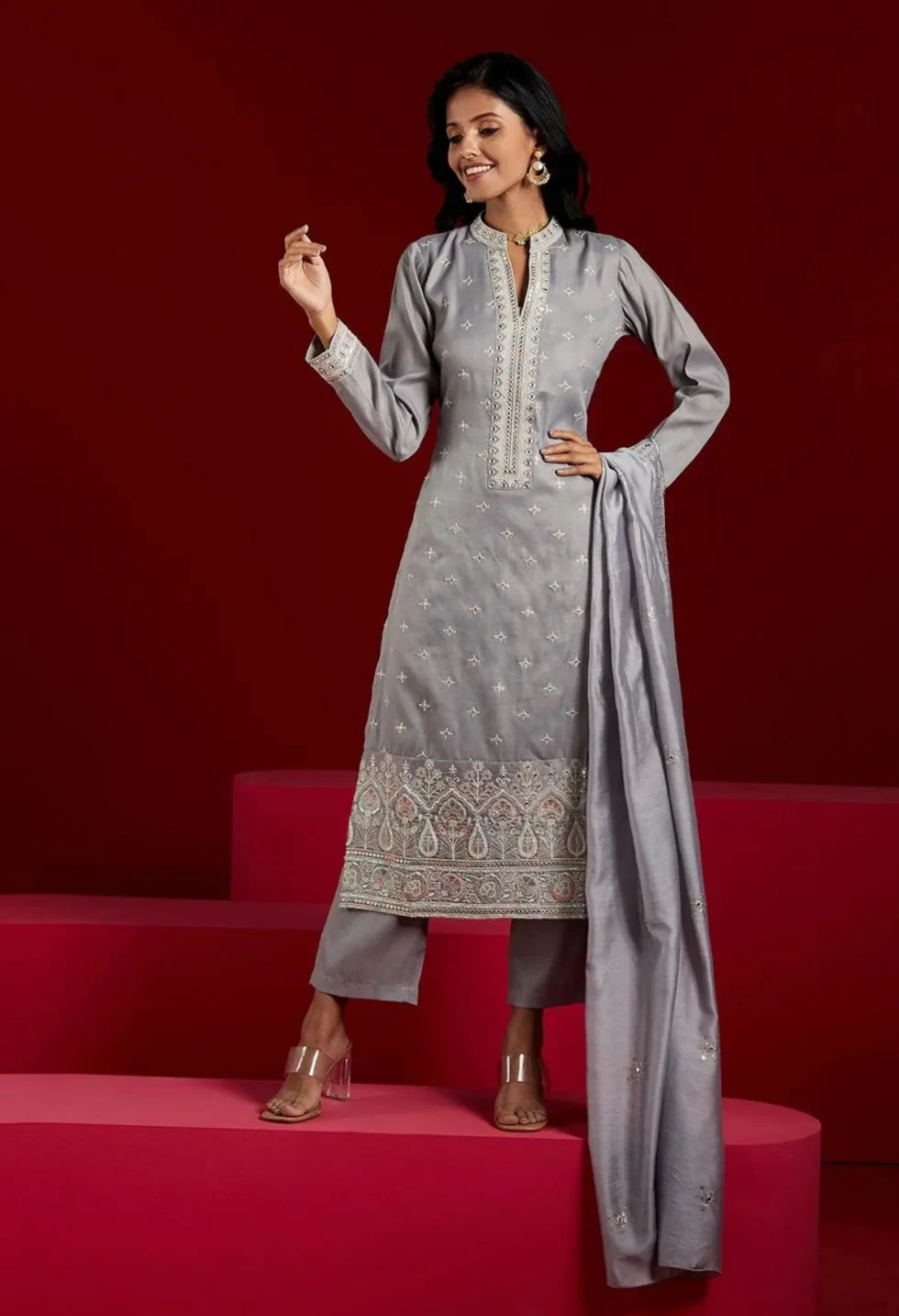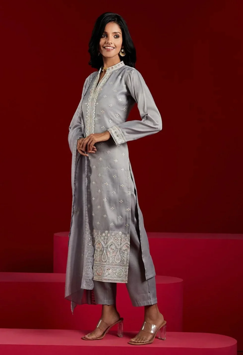 Memsaab Grey Embroidered Kurta Set with solid trousers and dupatta — floral embroidery in silk blend with mandarin collar, perfect for festive and cultural occasions.