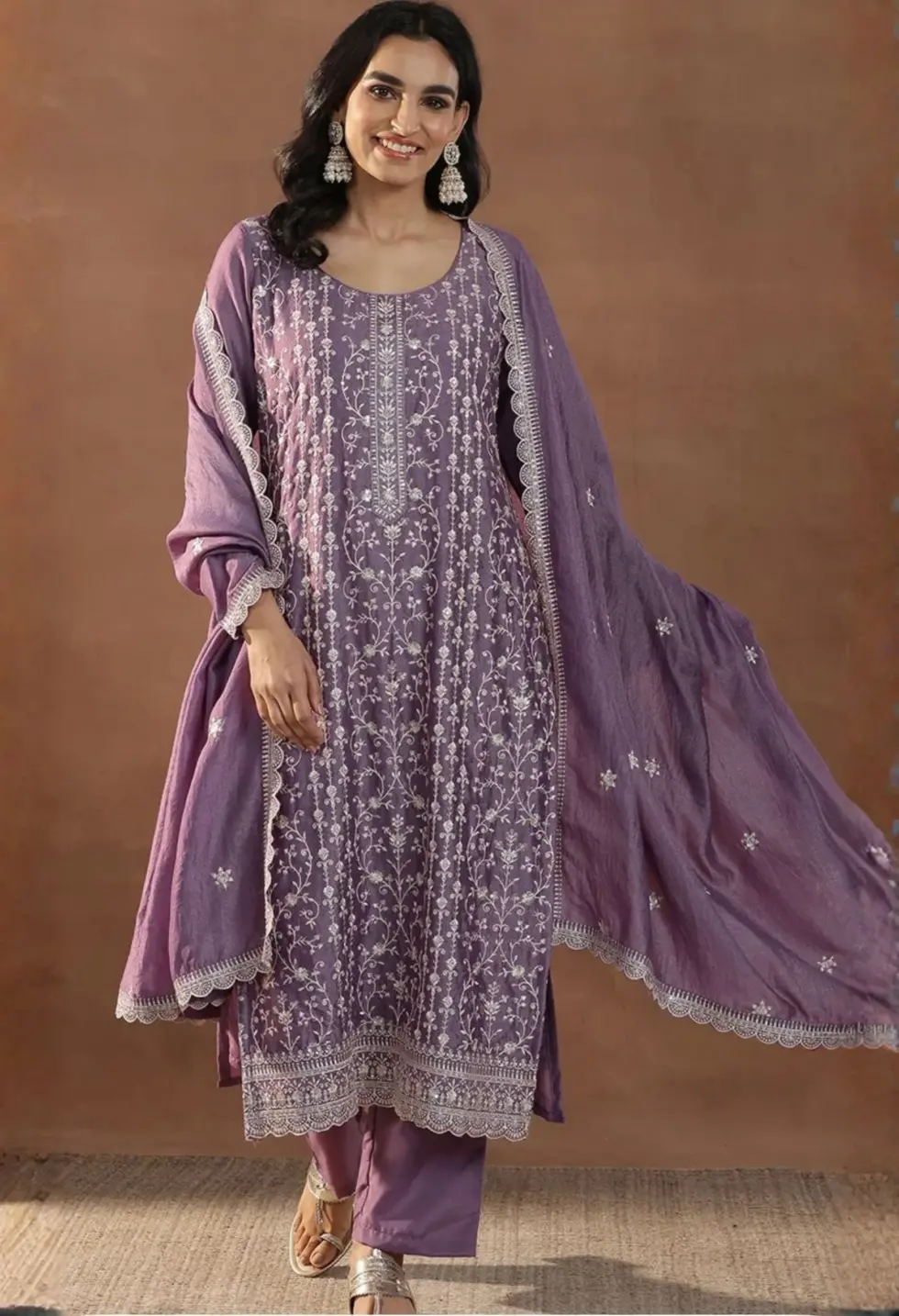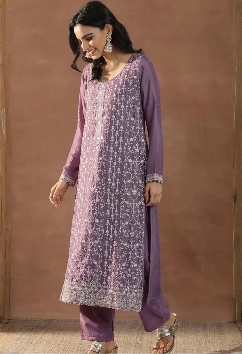 A soft lavender silk blend kurta set adorned with floral embroidery and zari highlights, paired with palazzos and a coordinated dupatta.