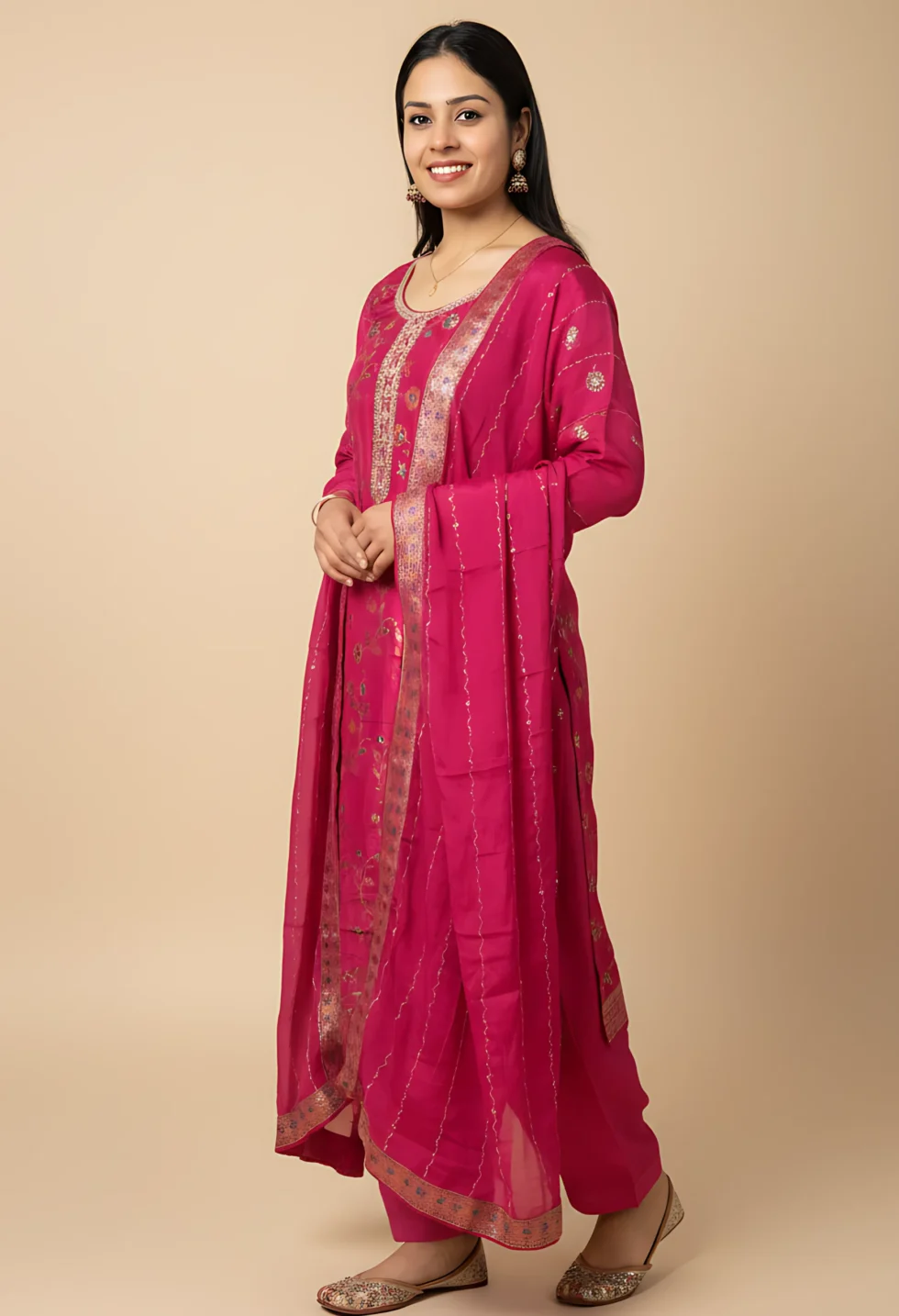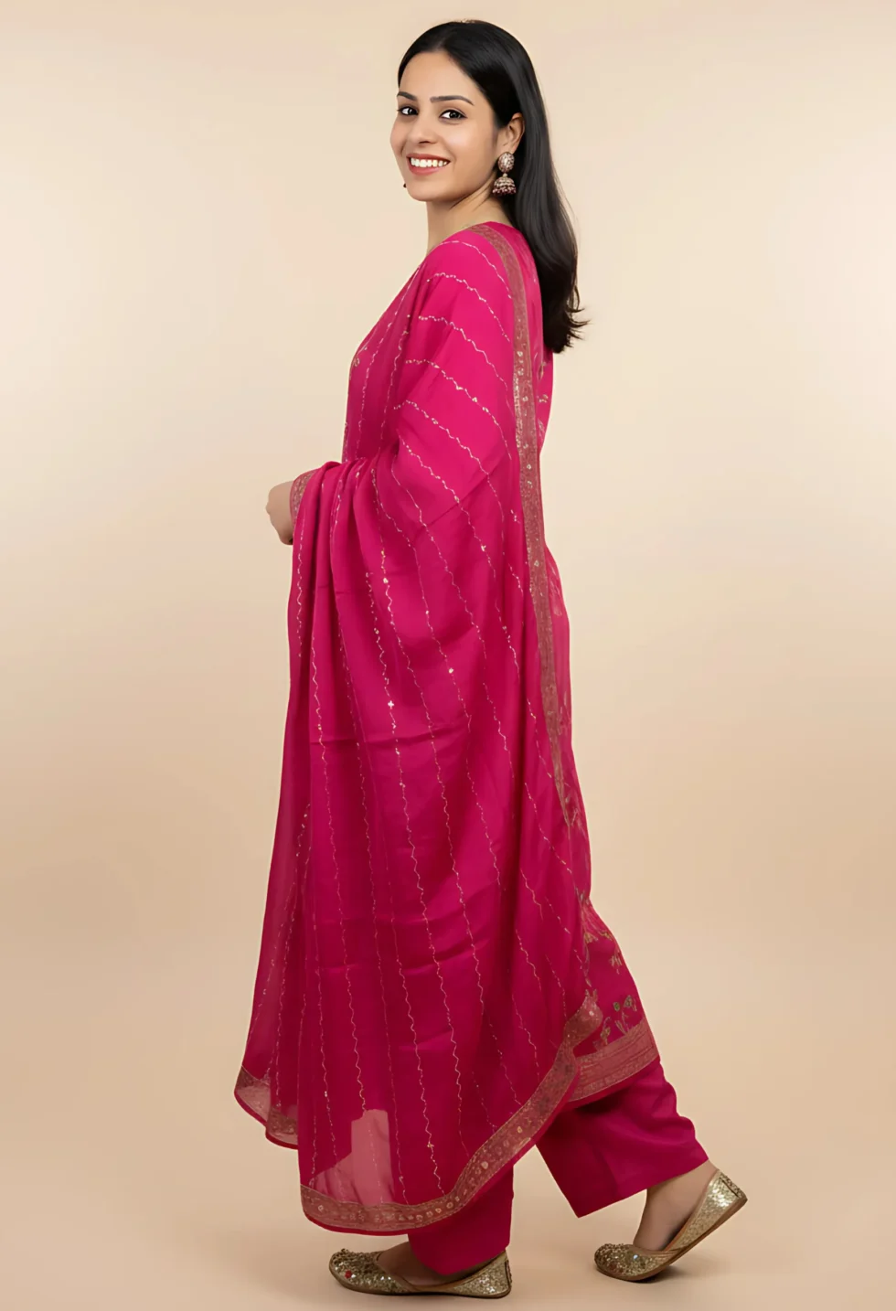 Memsaab Magenta Pink Silk Kurta Set with chiffon dupatta — elegant embroidery, scalloped border, and premium fabrics for festive occasions.