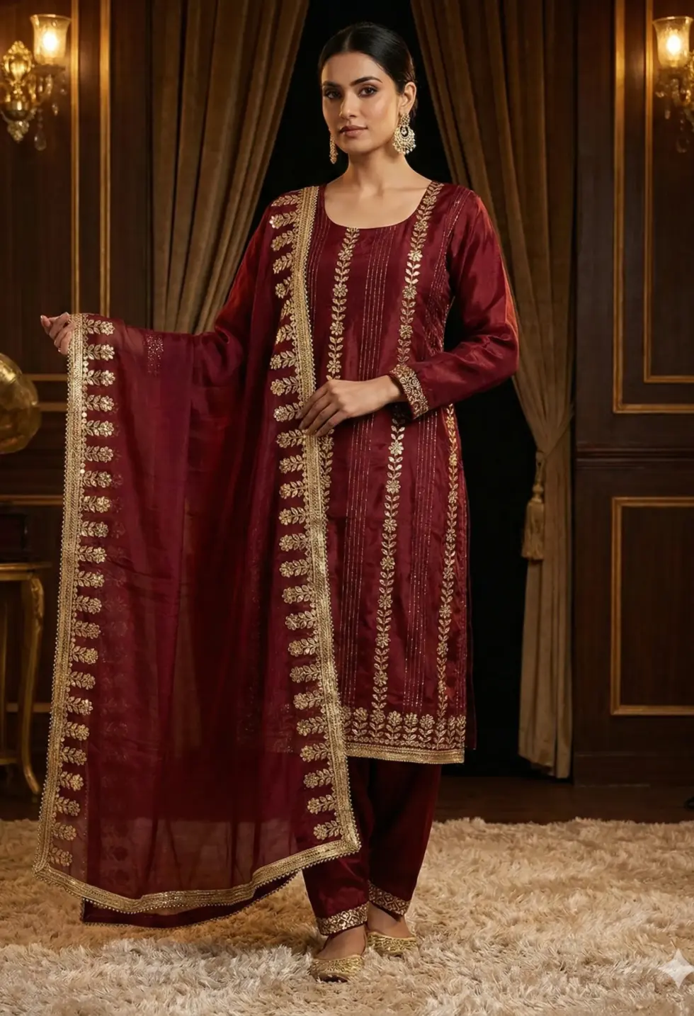 A graceful maroon crepe suit set detailed with elegant gold embroidery, designed for comfort, sophistication, and timeless festive styling.