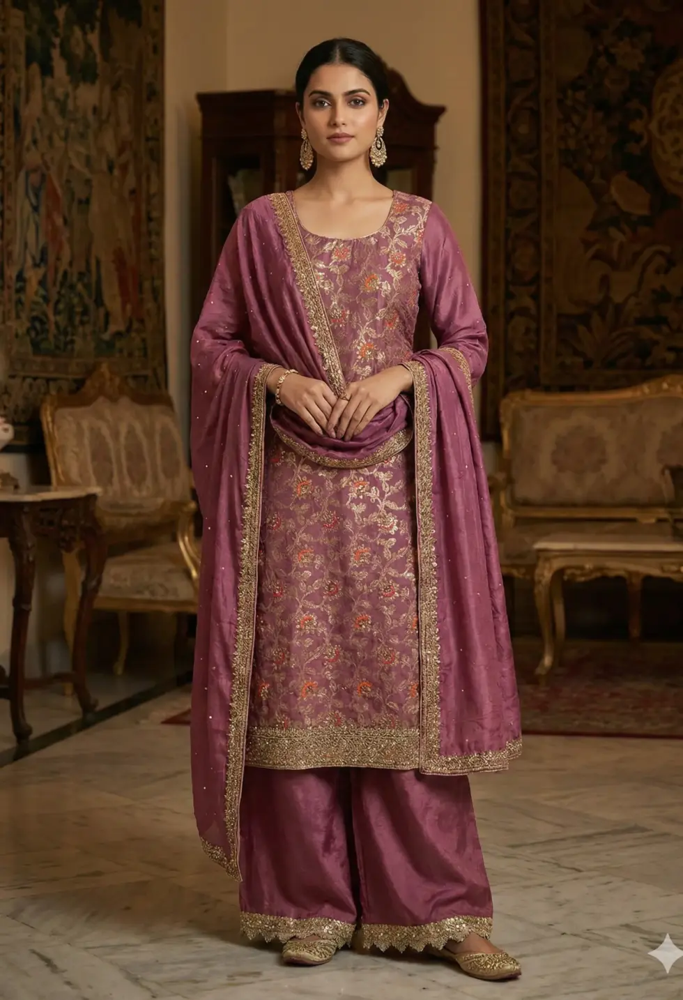 A luxurious mauve Kheen Khaab suit set featuring intricate woven detailing and a refined festive silhouette.