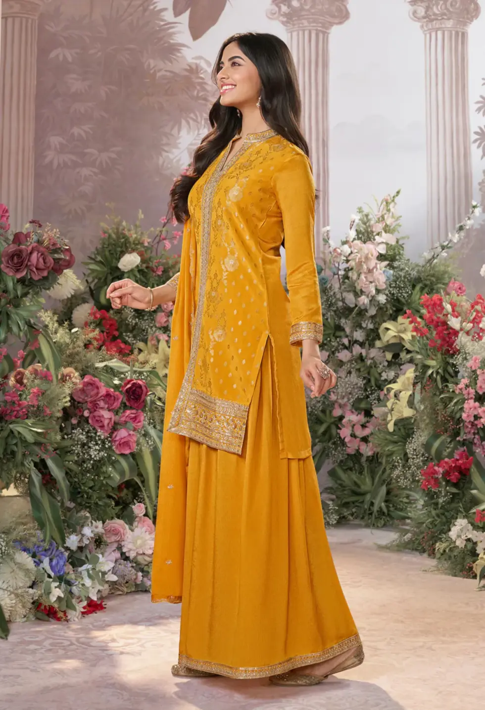 Memsaab Mustard Chinon Jacquard Kurta Set with embroidered dupatta — heavy jacquard design, scalloped border, and chinon fabric with mul cotton lining.