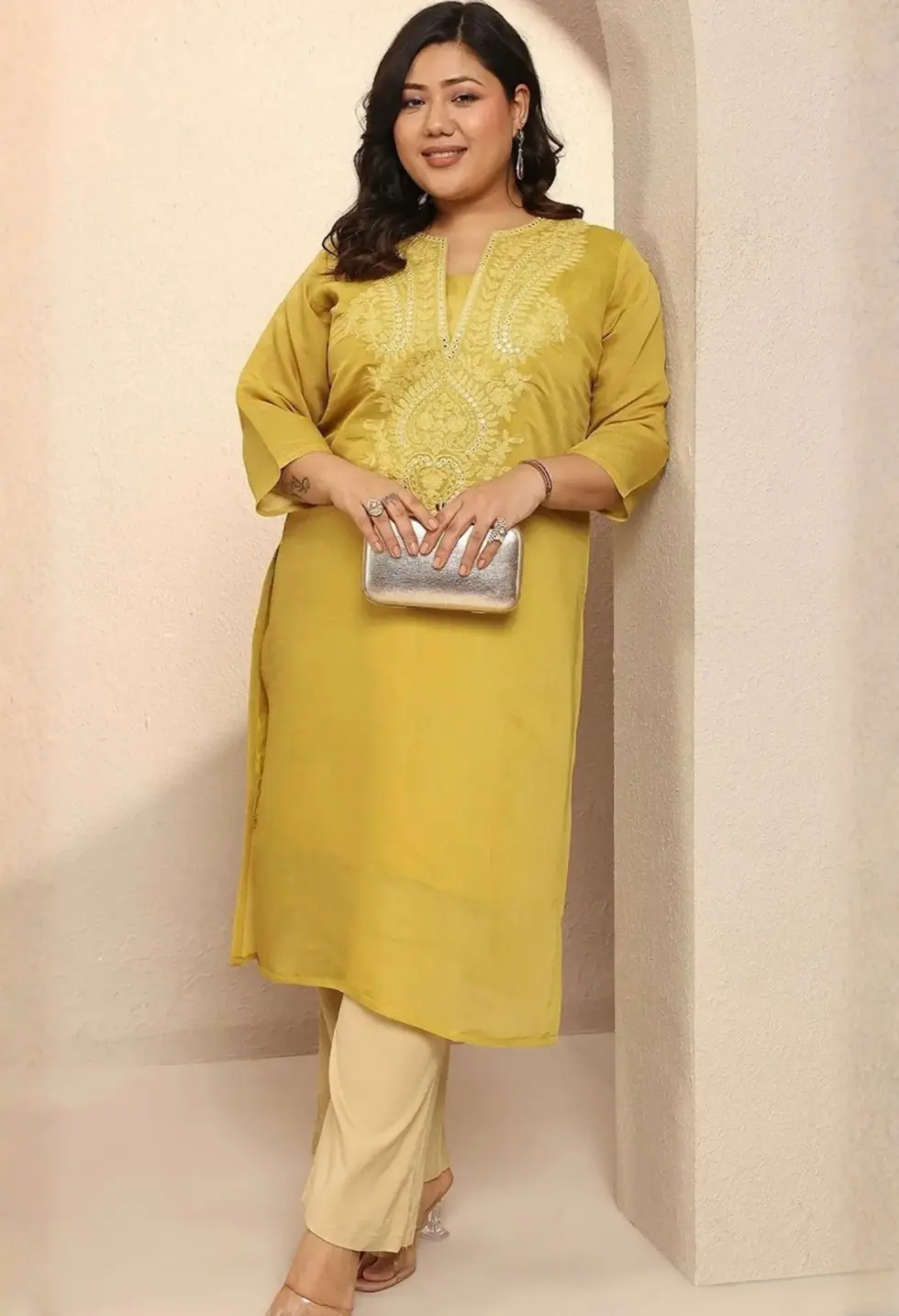 Memsaab Mustard Embroidered Mirror Work Kurta crafted in machine-weave silk with mirror accents, delicate embroidery, and a straight elegant silhouette.