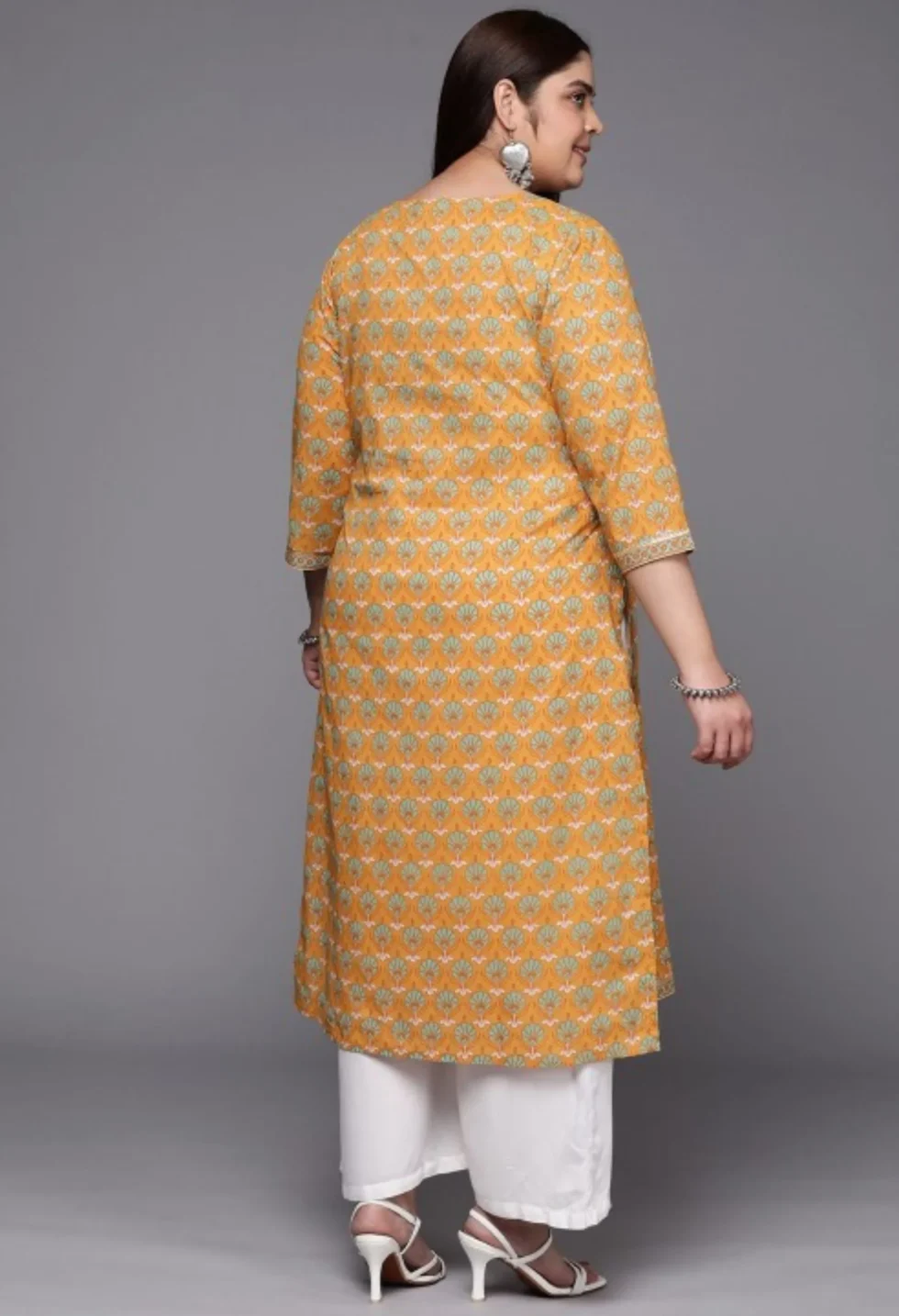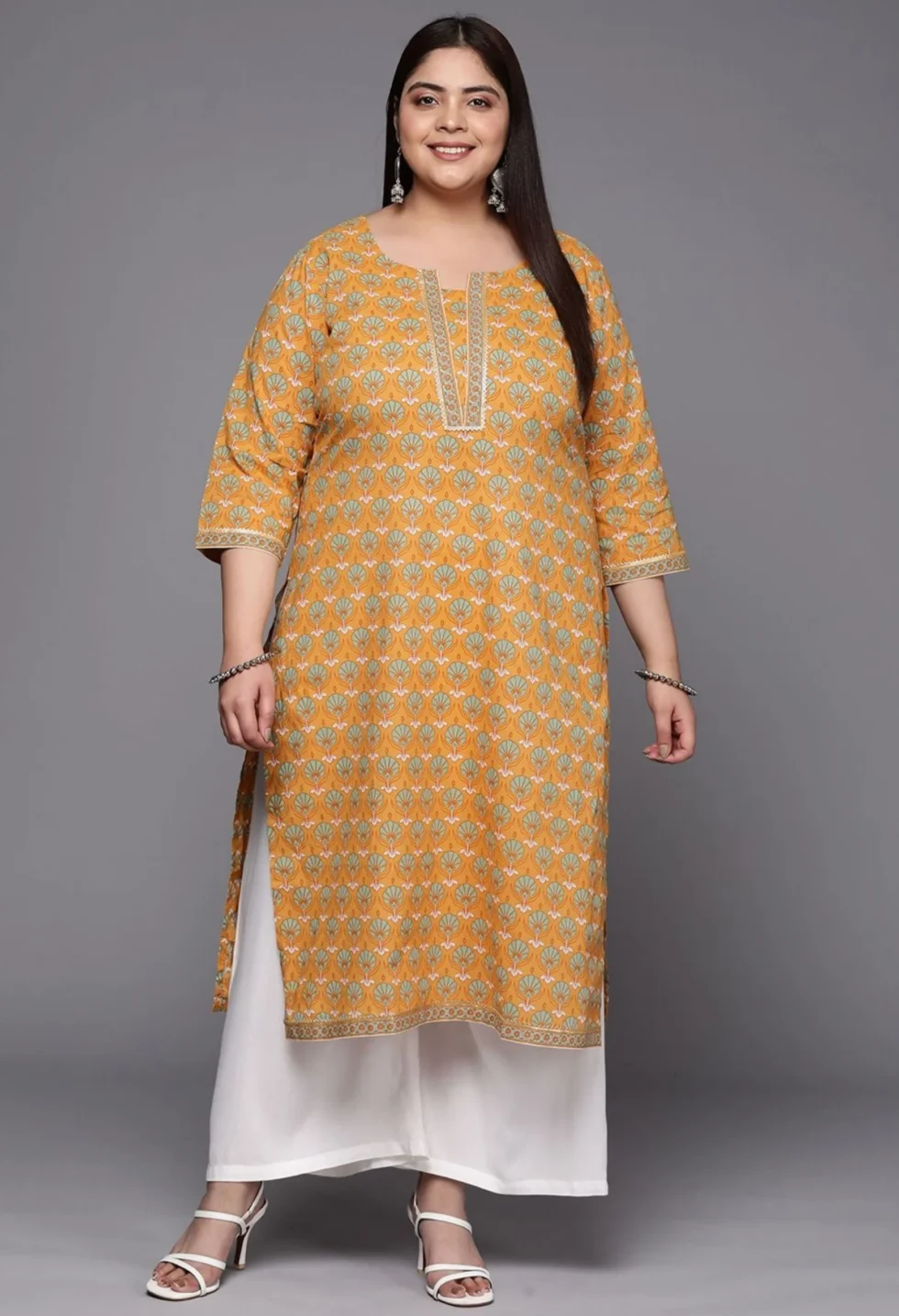 The Memsaab Mustard Gotta Patti Pure Cotton Kurta features a floral print with gotta patti detailing, round neck, and three-quarter sleeves. Made from pure cotton, perfect for casual and festive occasions.