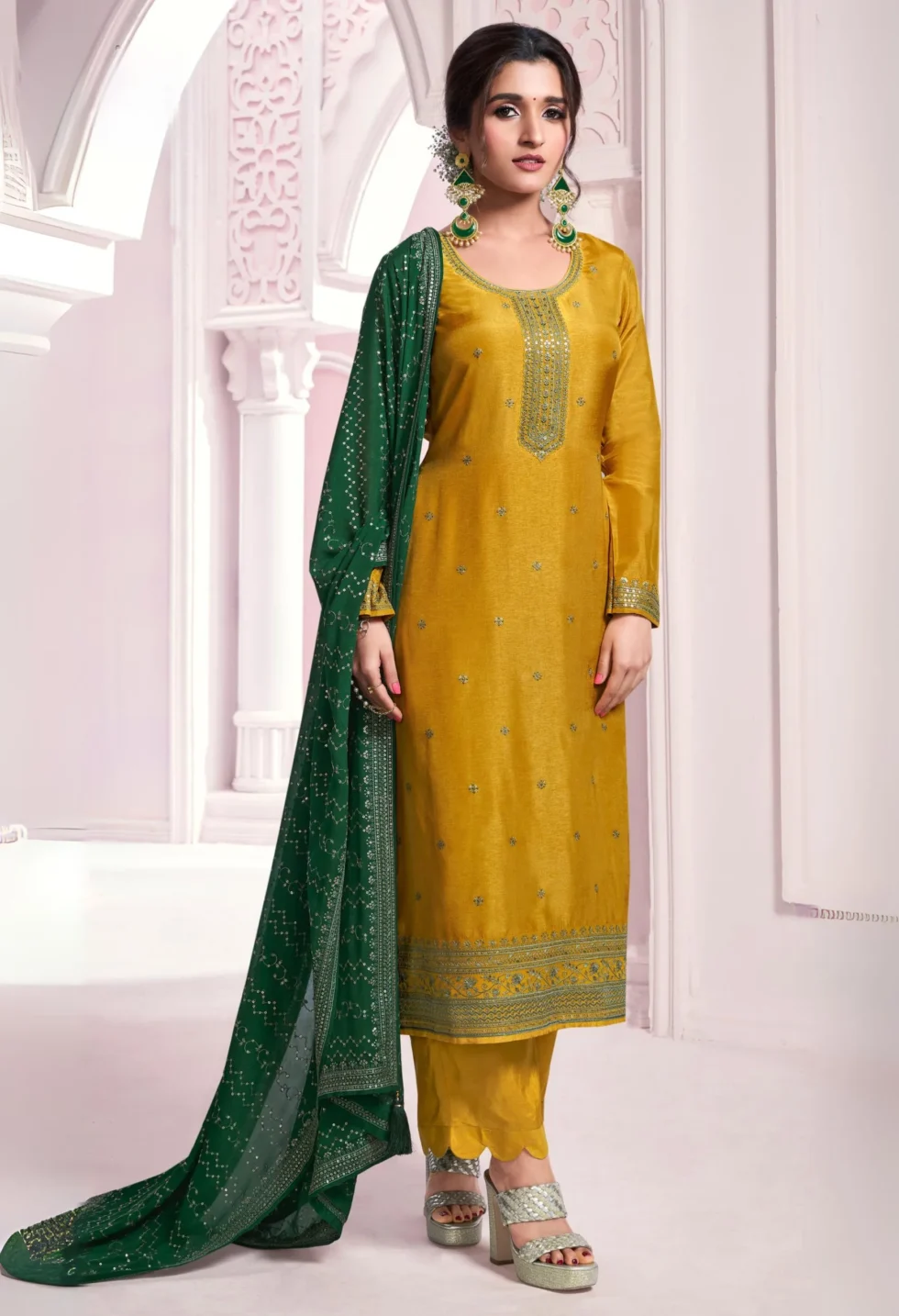 The Memsaab Mustard Thread Embroidered Silk Suit Set is an ideal choice for those looking to blend traditional aesthetics with modern style. Make a statement at your next event with this stunning outfit.