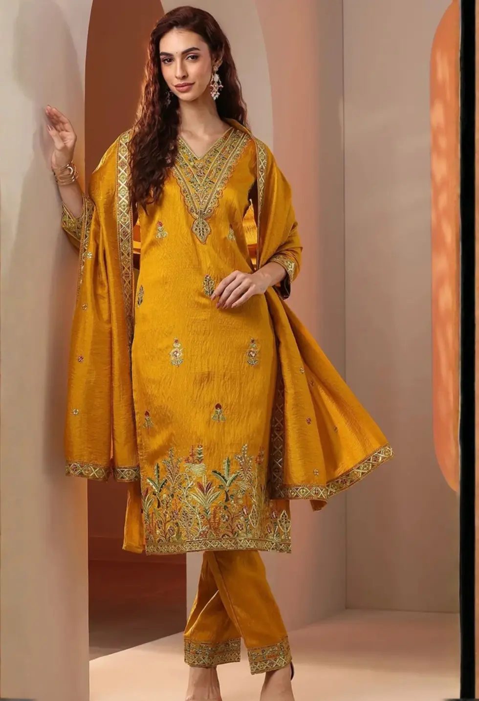 Radiant mustard yellow kurta set with elegant embroidery detailing.
