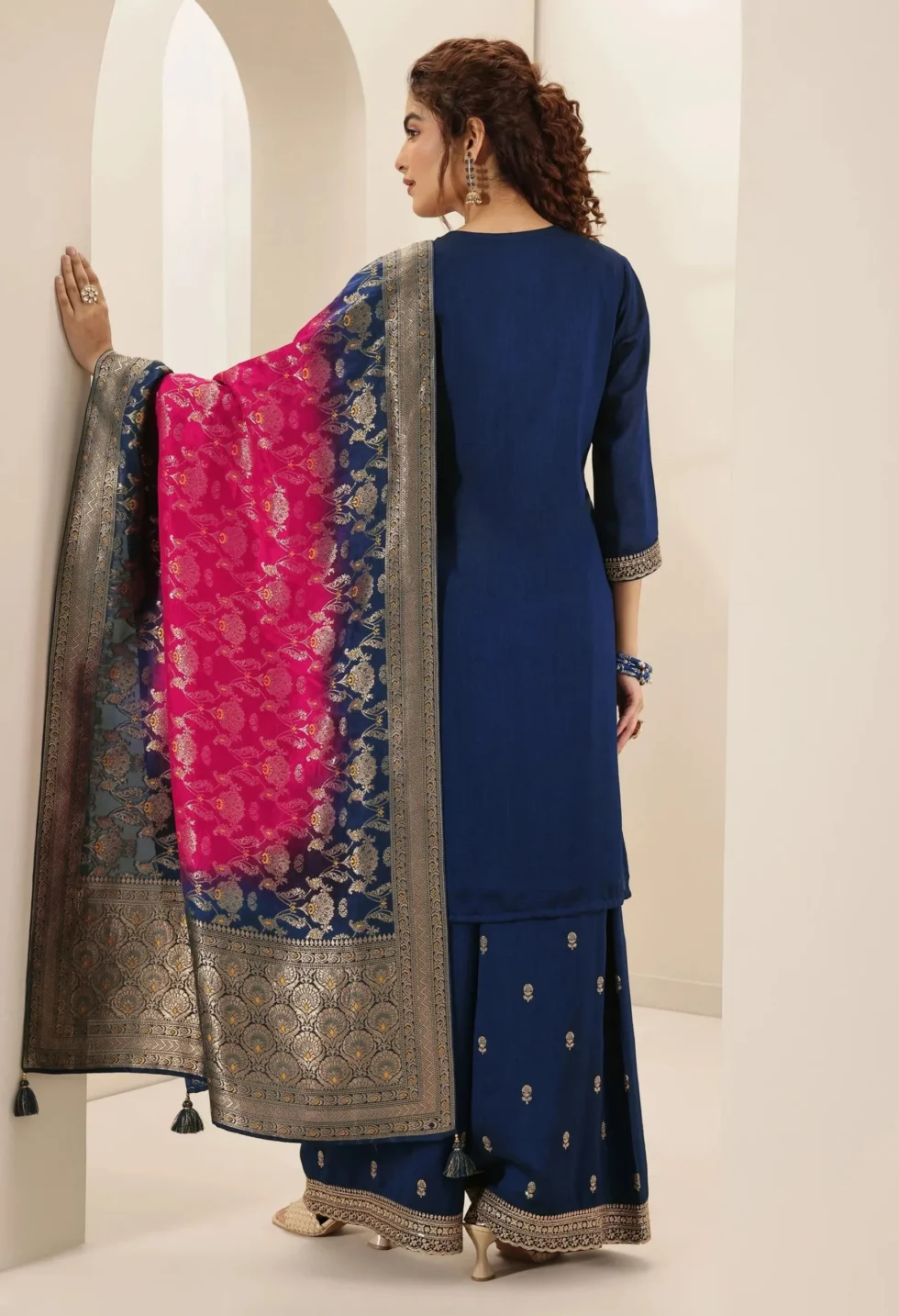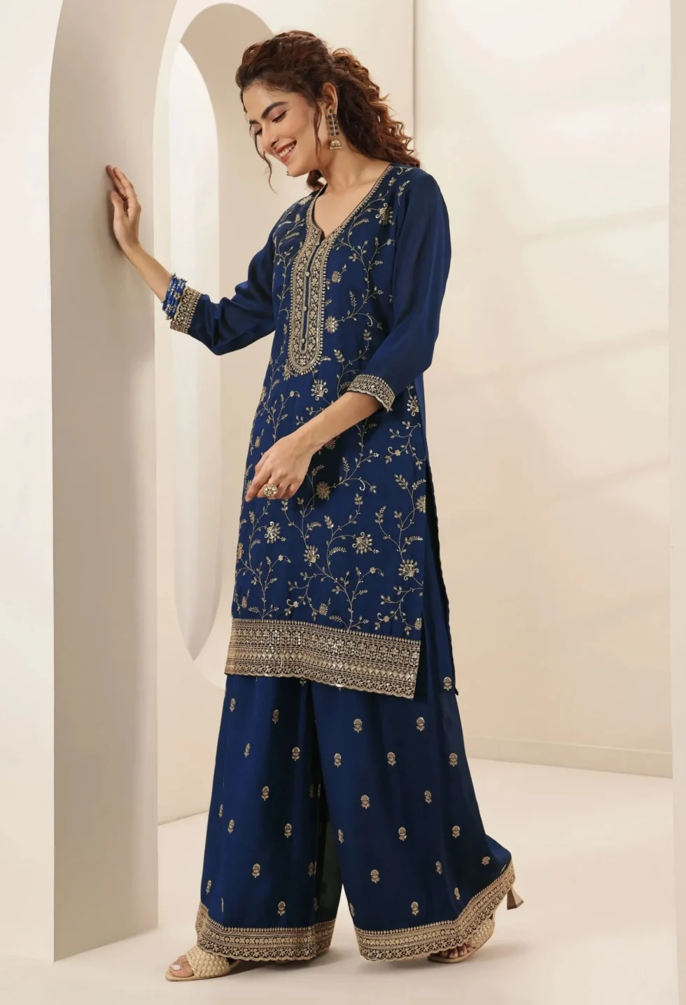 Memsaab Navy Blue Embroidered Kurta Sharara Set with dupatta — sequinned floral embroidery, sweetheart neckline, and silk blend fabric with lining.