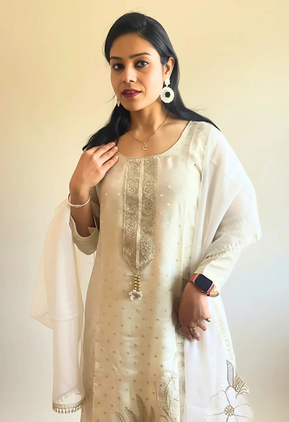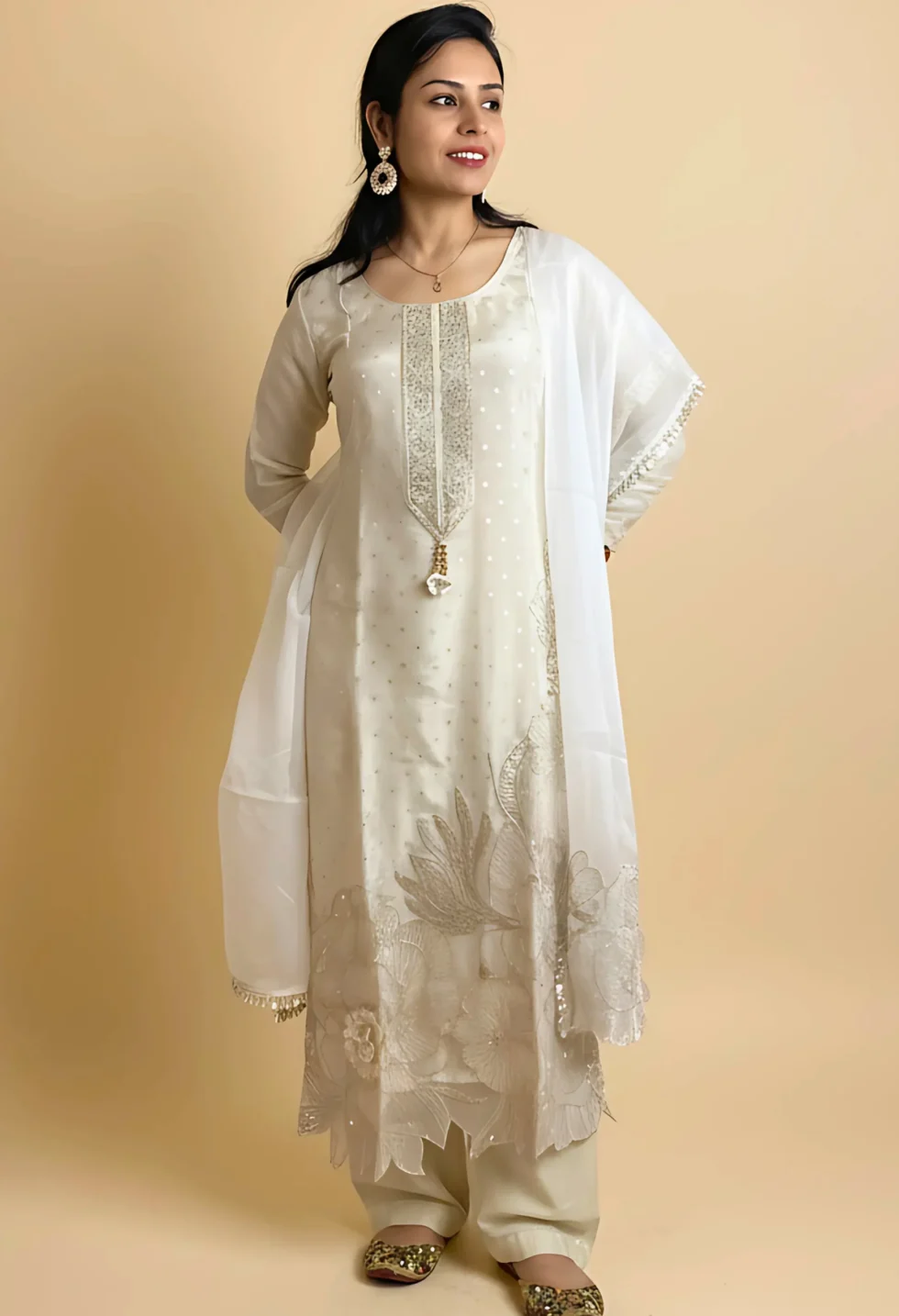 • Style: This Memsaab Off-White Flower Cut Kurta Palazzo Set blends traditional handwork with modern elegance
