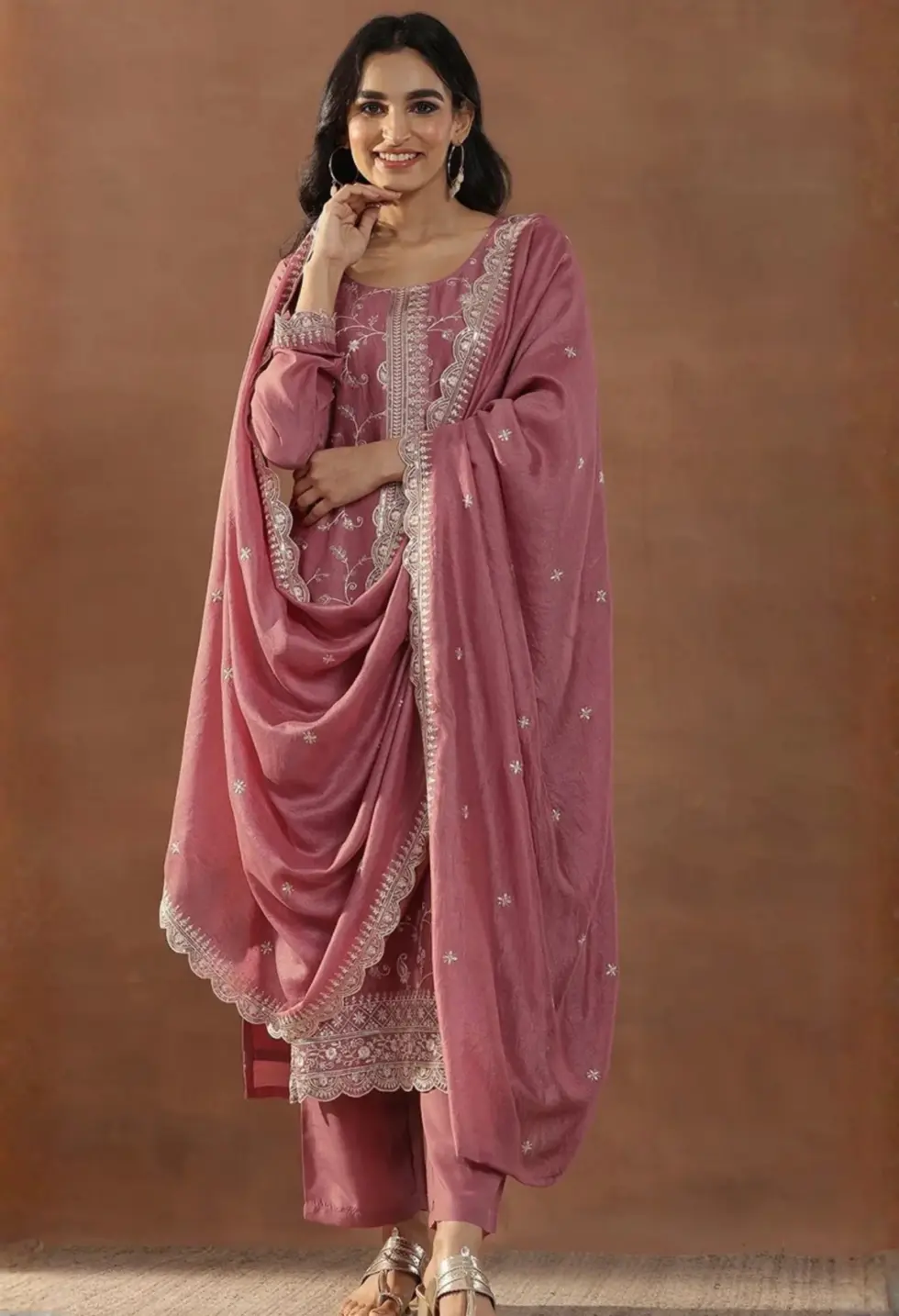 A sophisticated onion pink silk blend kurta set featuring floral embroidery, delicate sequins, scalloped hemline, and a coordinated dupatta.