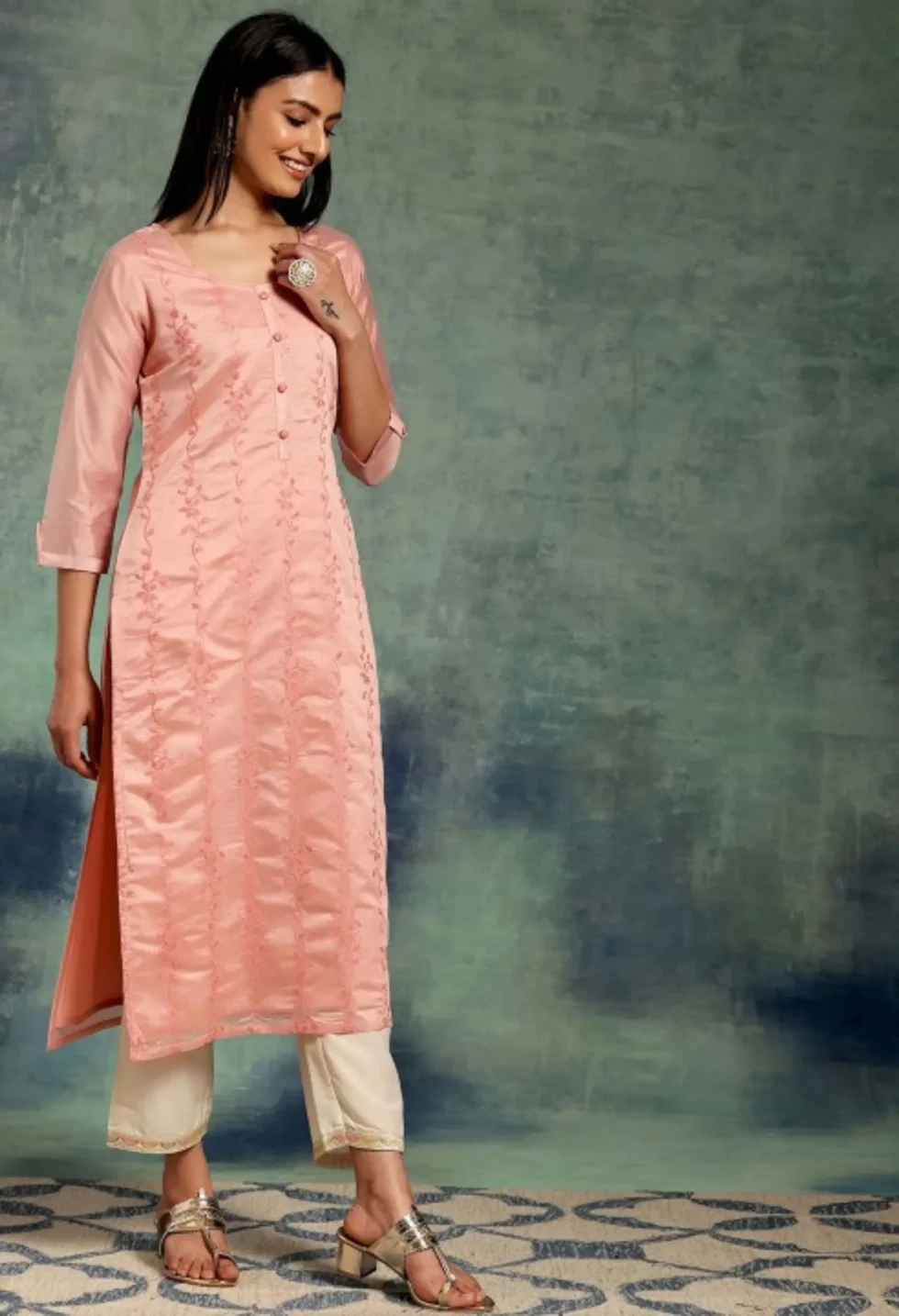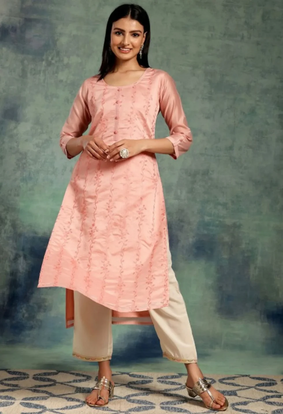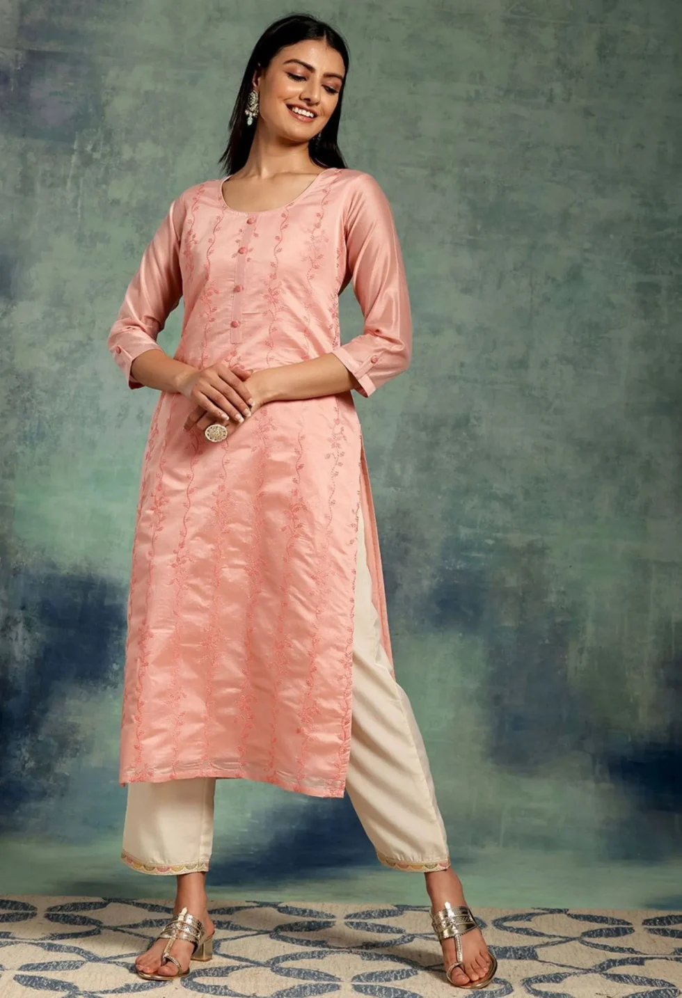 The Memsaab Peach Embroidered Silk Kurta features floral embroidery, a round neck, and thread work detail. Made from chanderi silk, it’s perfect for festive and formal occasions.
