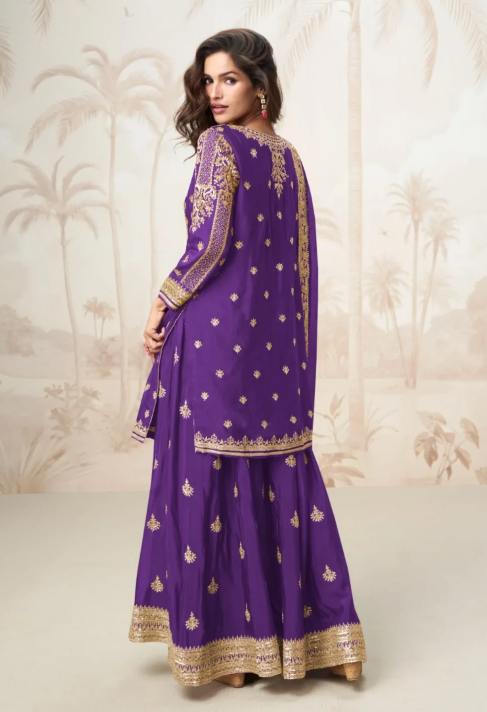 Memsaab Purple Embroidered Kurta Sharara Set with chiffon dupatta — front & back embroidery, zari detail, and silk blend fabric for festive elegance.