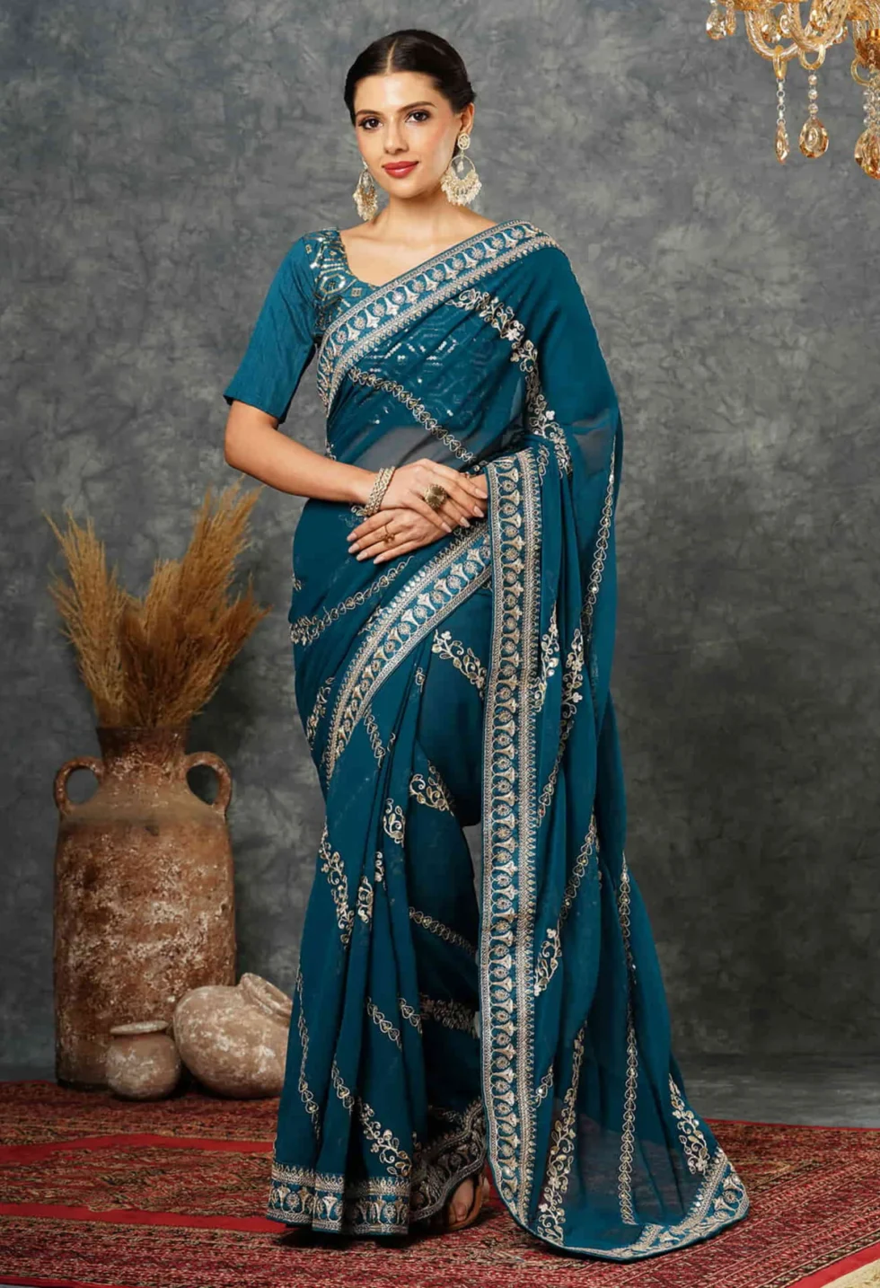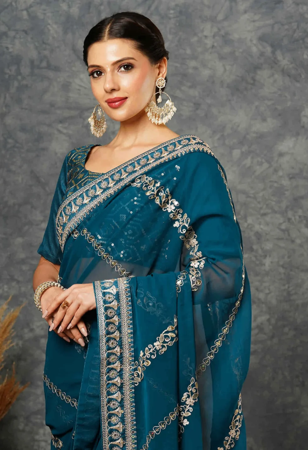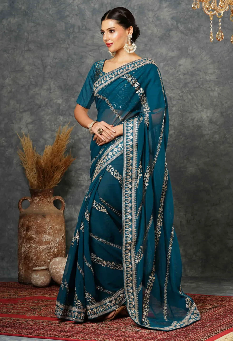 A graceful rama blue georgette saree with sequin embroidery and lace detailing, paired with a stylish Bhagalpuri silk blouse for festive charm.